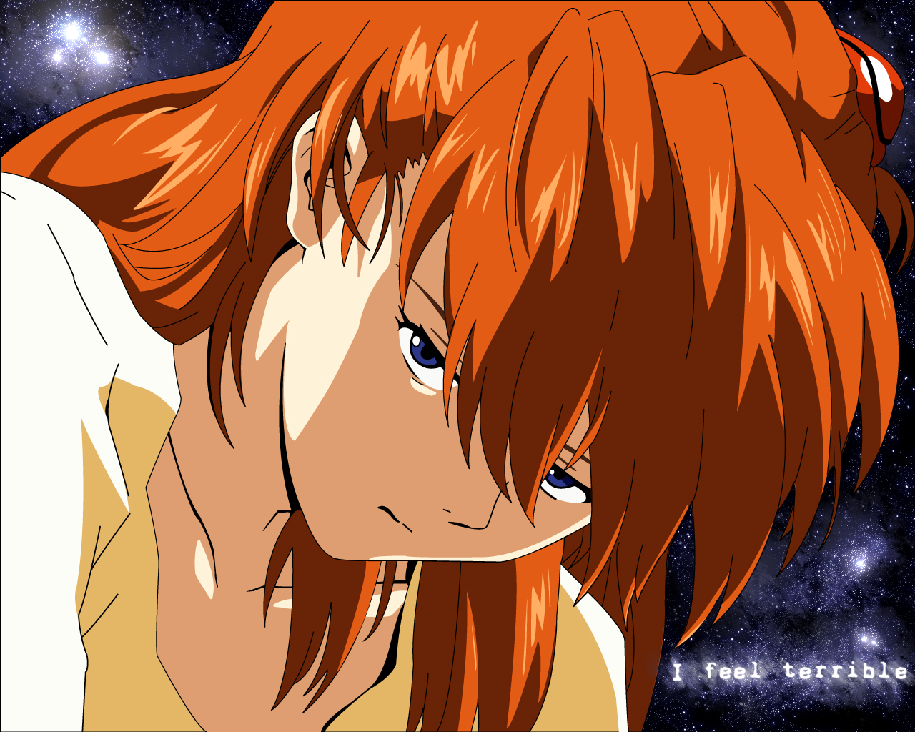 Description: A girl with red hair and blue eyes looking at the stars in the sky with her hand on her face.