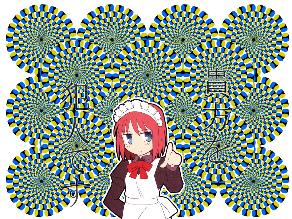 Description: A girl with red hair and a bow tie is standing in front of a circular pattern of blue and yellow circles.