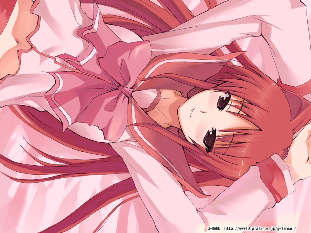 Description: A girl with red hair and a pink dress is laying down with her hands on her head and her eyes closed.