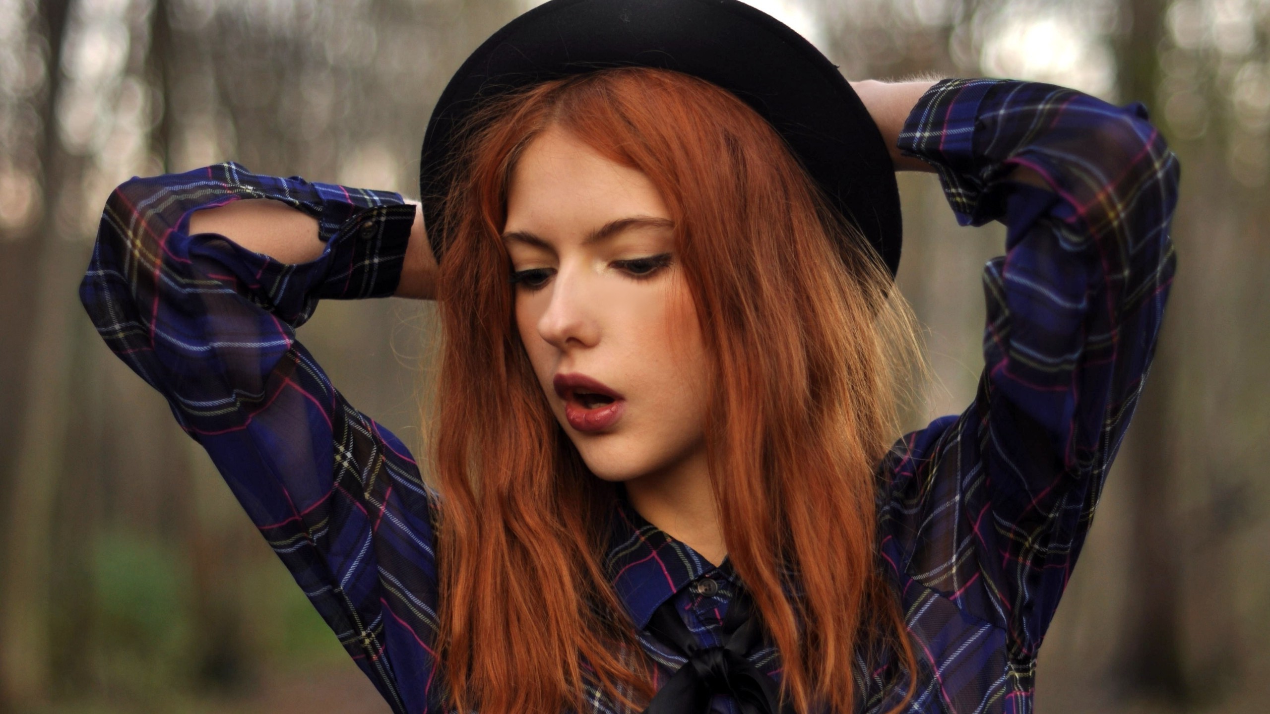 Description: A woman with red hair wearing a hat and a plaid shirt and tie in the woods with trees in the background.
