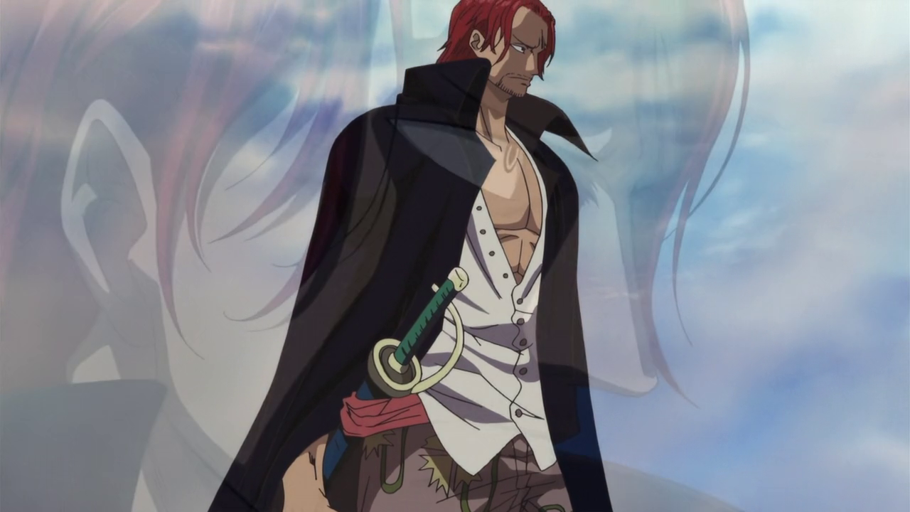Description: A man with red hair and a black coat is standing in front of a blue sky with clouds and a sword.