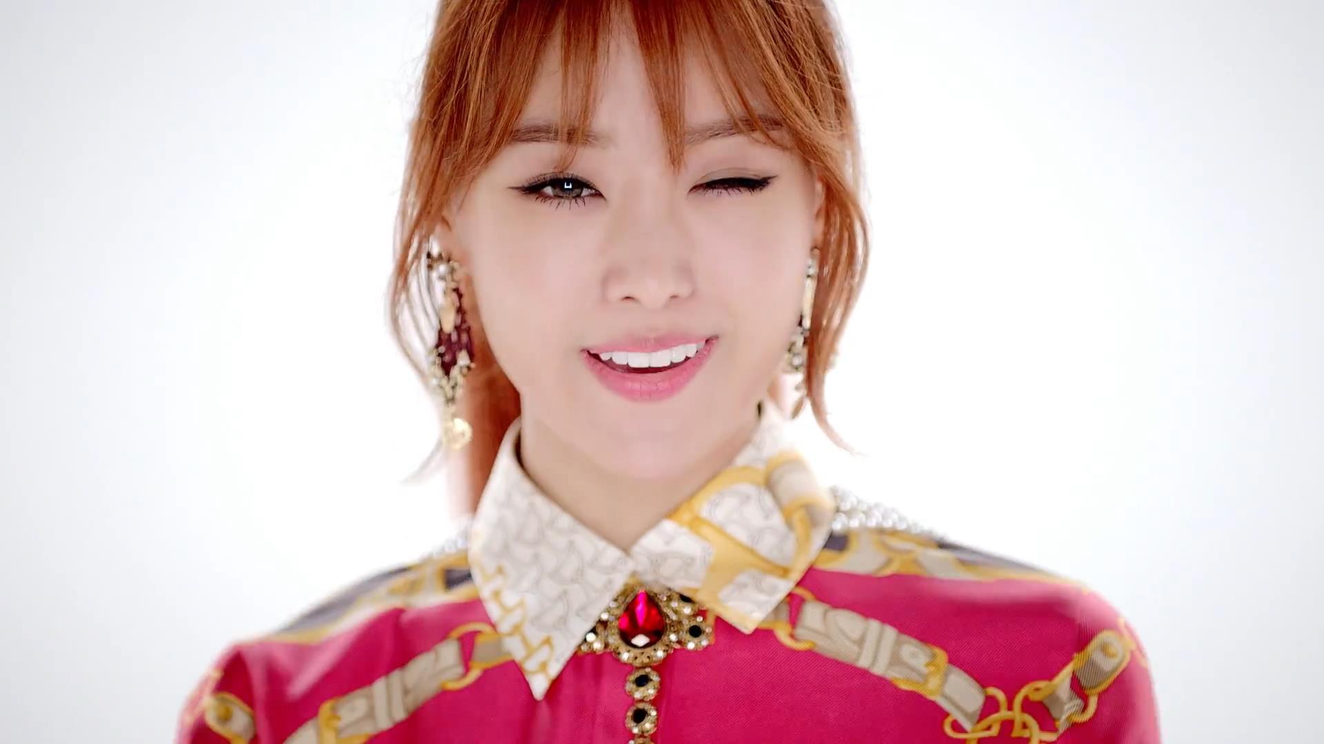 Description: A woman with red hair and a pink shirt with gold trimmings and a white collared shirt.
