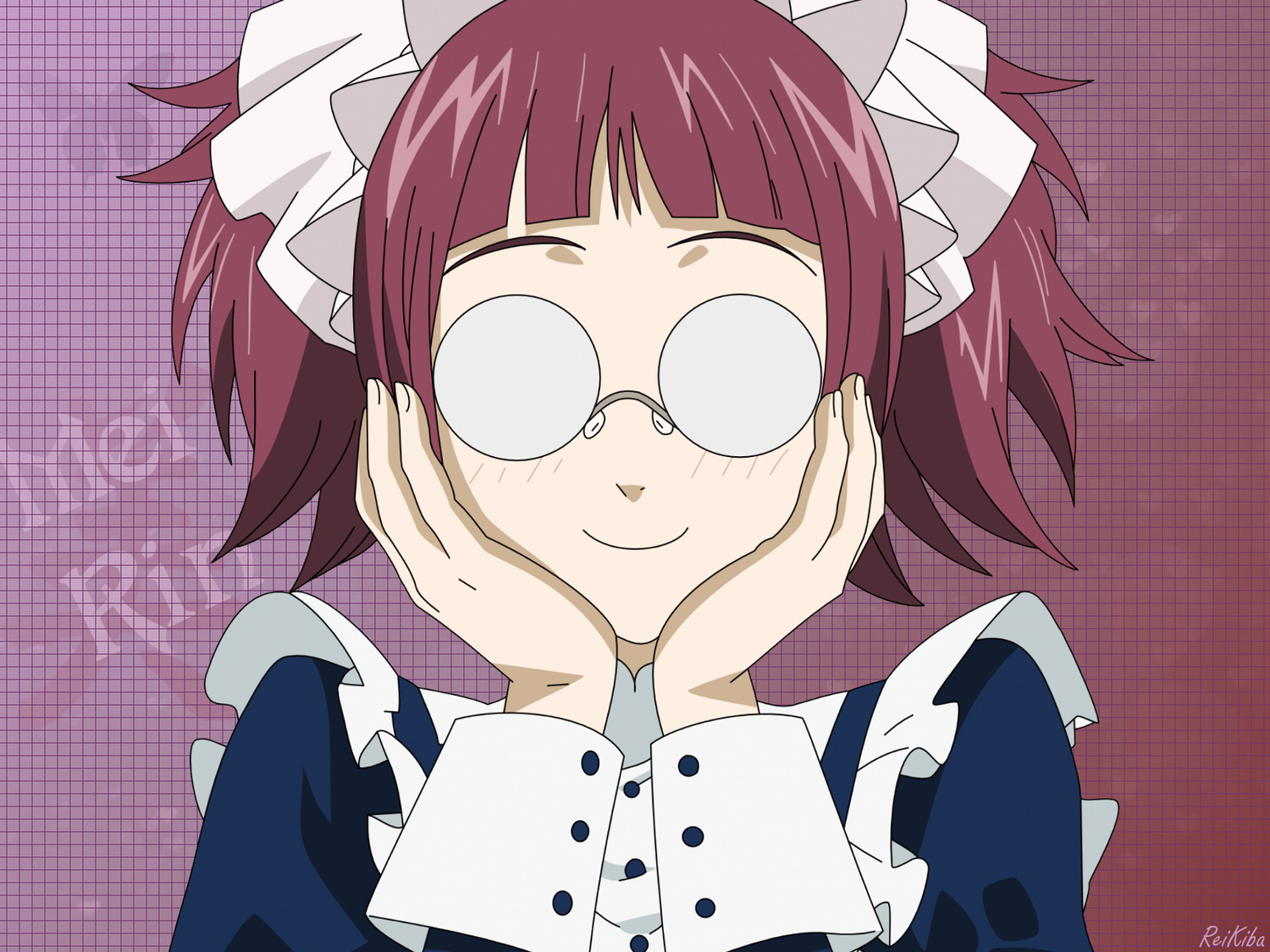 Description: A anime character with red hair and a white top on holding her hands to her face and looking at the camera.