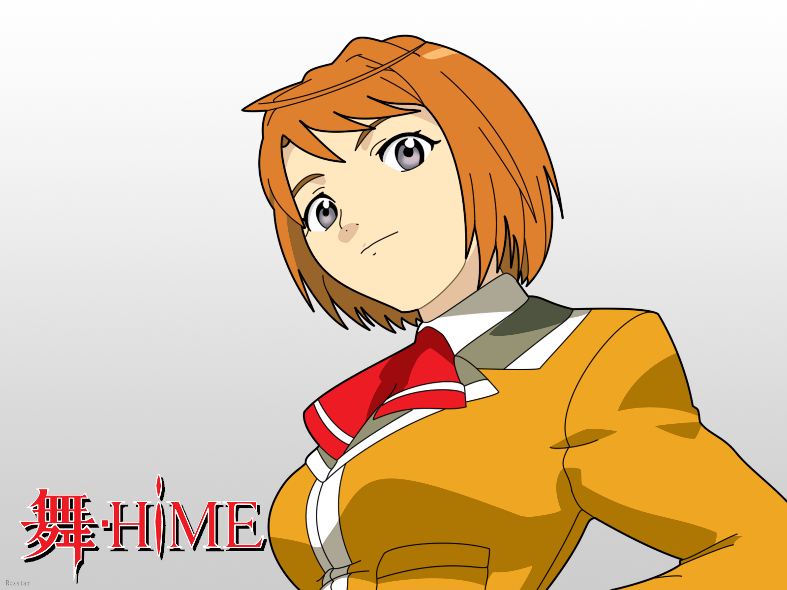 Description: A woman with red hair and a yellow jacket is standing in front of a white background with the words hime written in chinese.