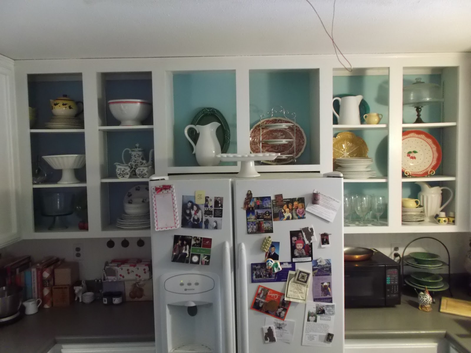 Description: A refrigerator with a bunch of magnets on it in a kitchen with white cabinets and a counter top.