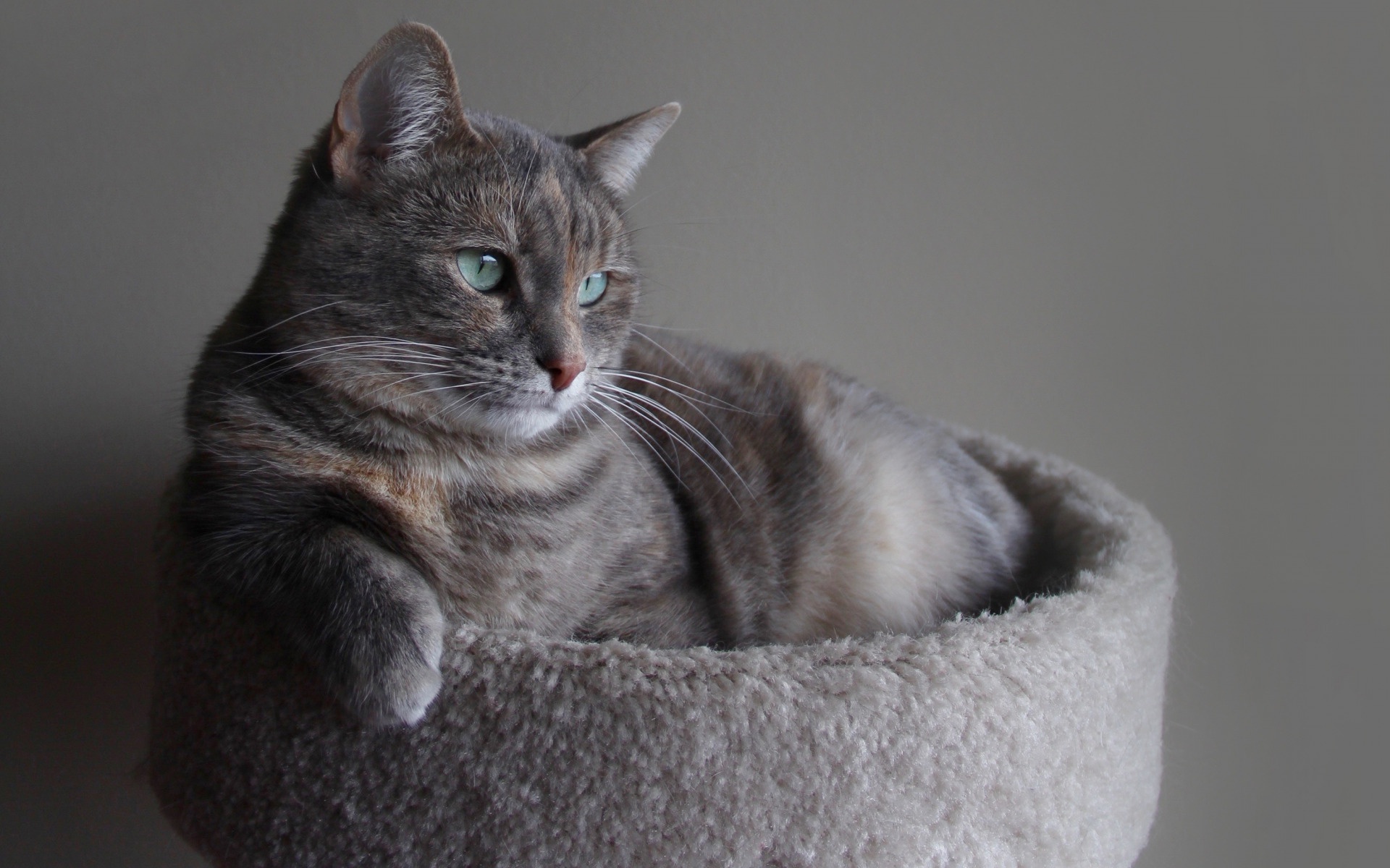 Description: A cat is sitting in a cat bed with a blue eyes and a whiskers tail.