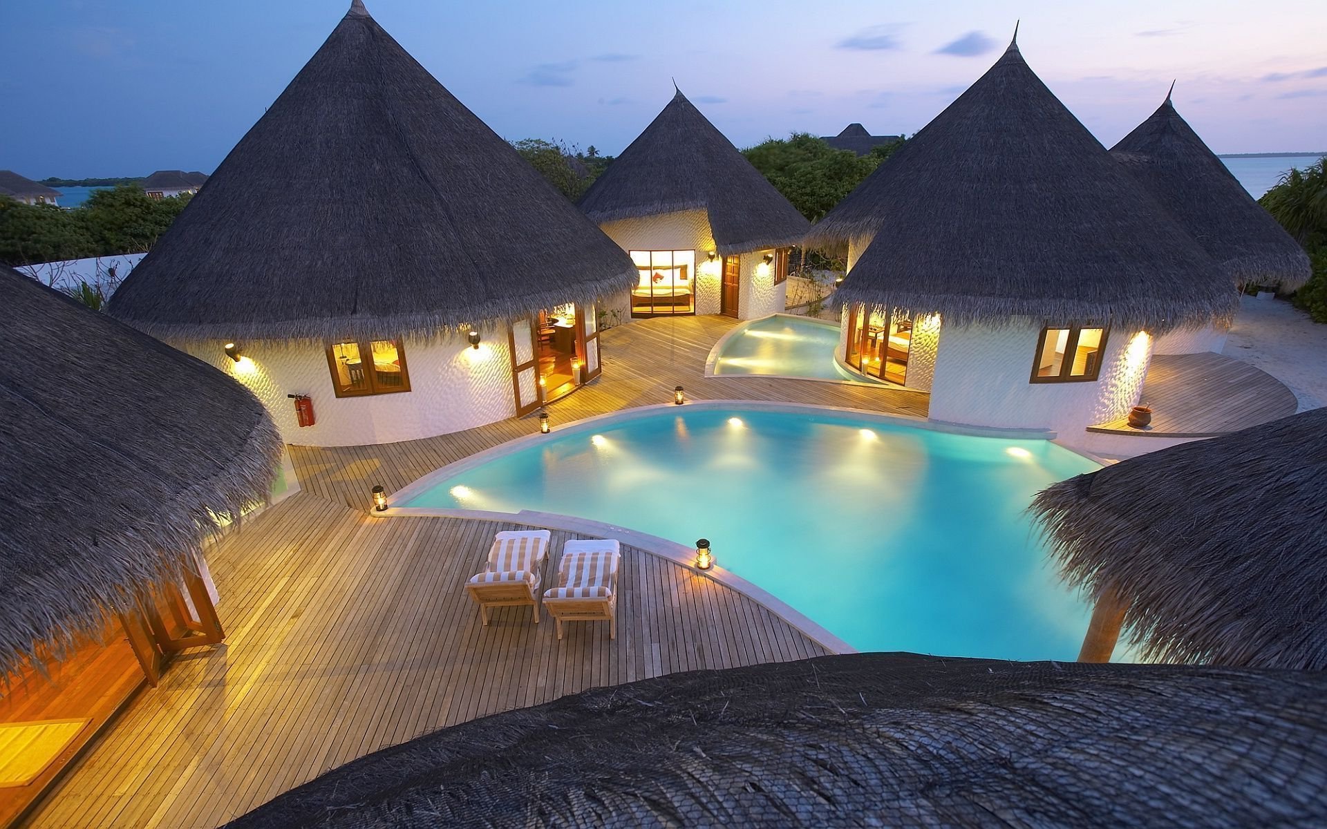 Description: A resort with a pool and thatched roof huts at dusk time.
