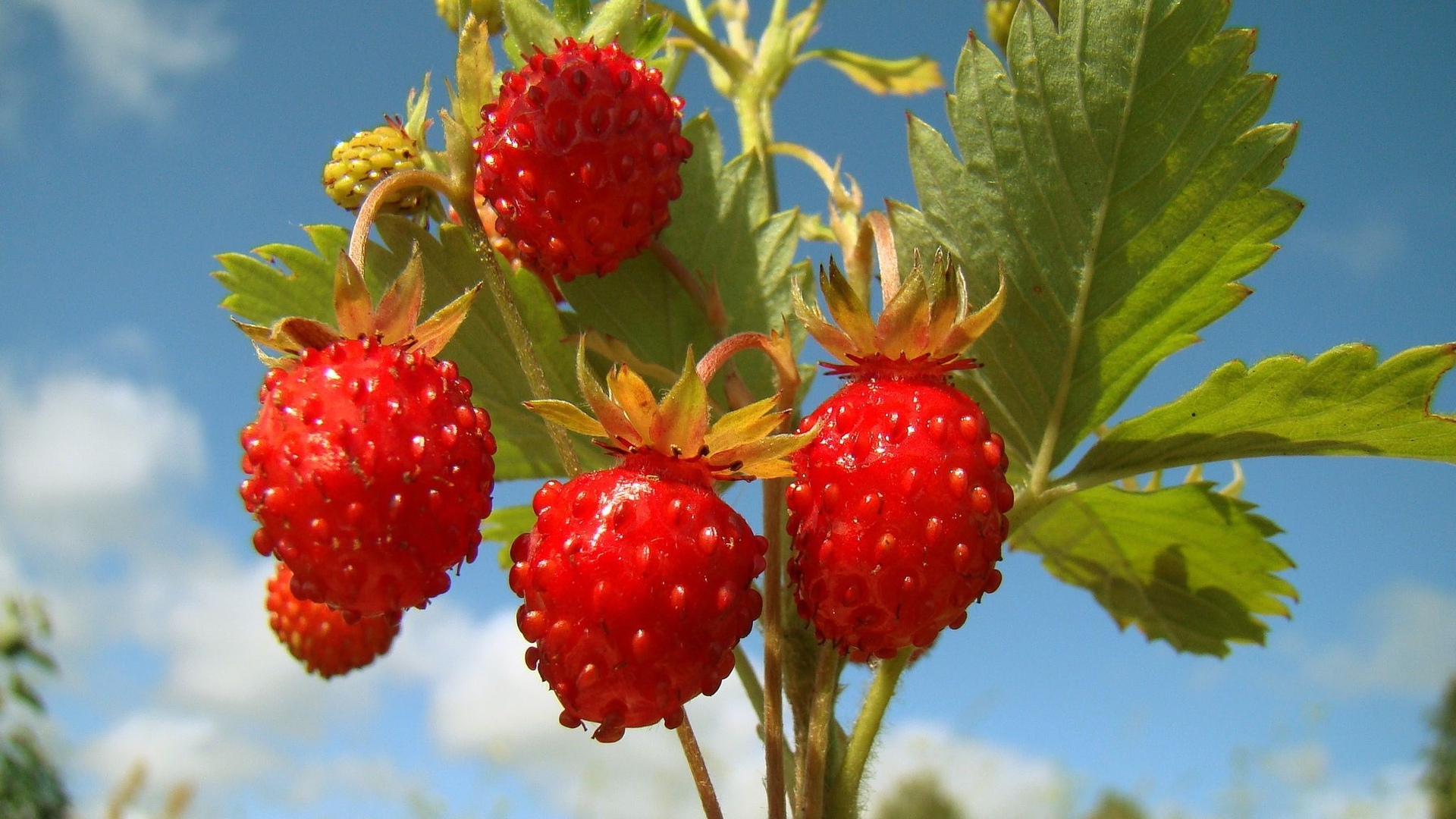 Description: A bunch of ripe berries hanging from a tree branch with leaves and sky in the background with clouds in the background.