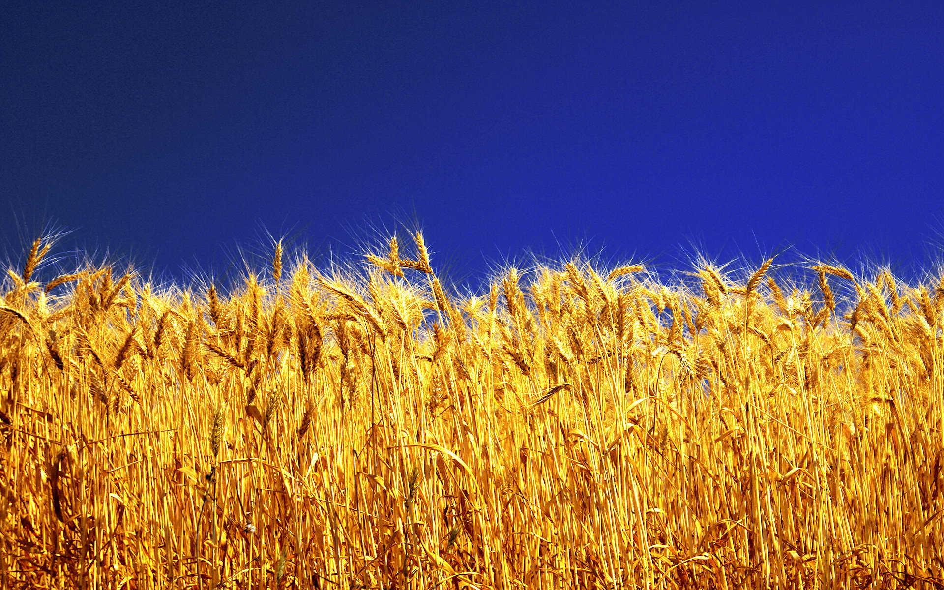 Description: A field of ripe wheat against a blue sky background with a few clouds in the distance.