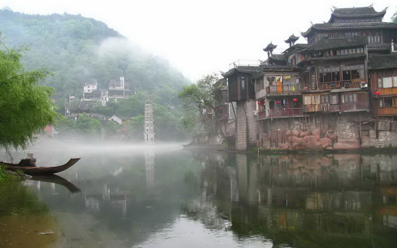 Description: A river with a boat in the middle of it and buildings on the other side of the river and fog in the air.