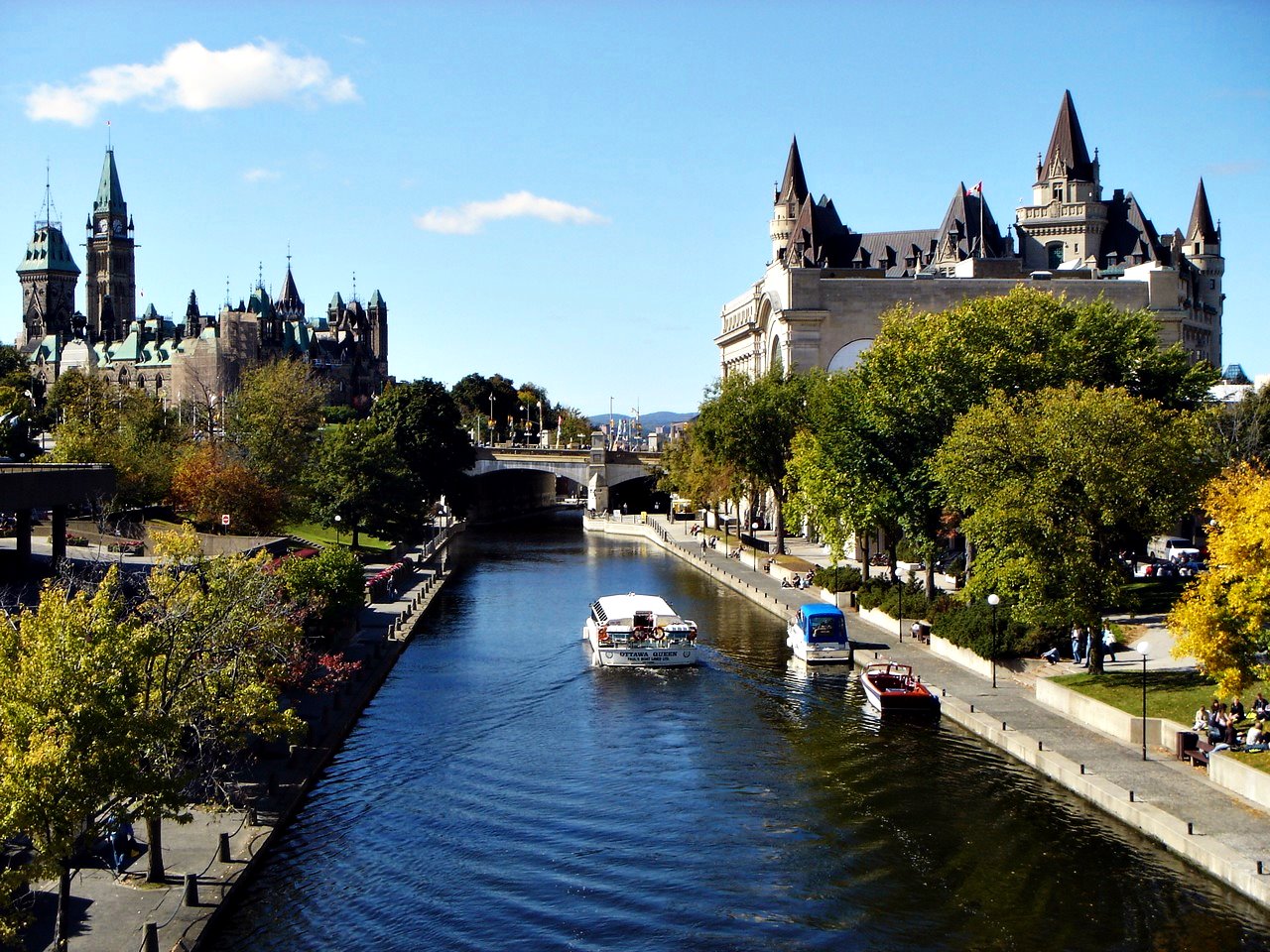 Description: A river with a boat in it and a castle in the background with a bridge over it and a few boats in the water.