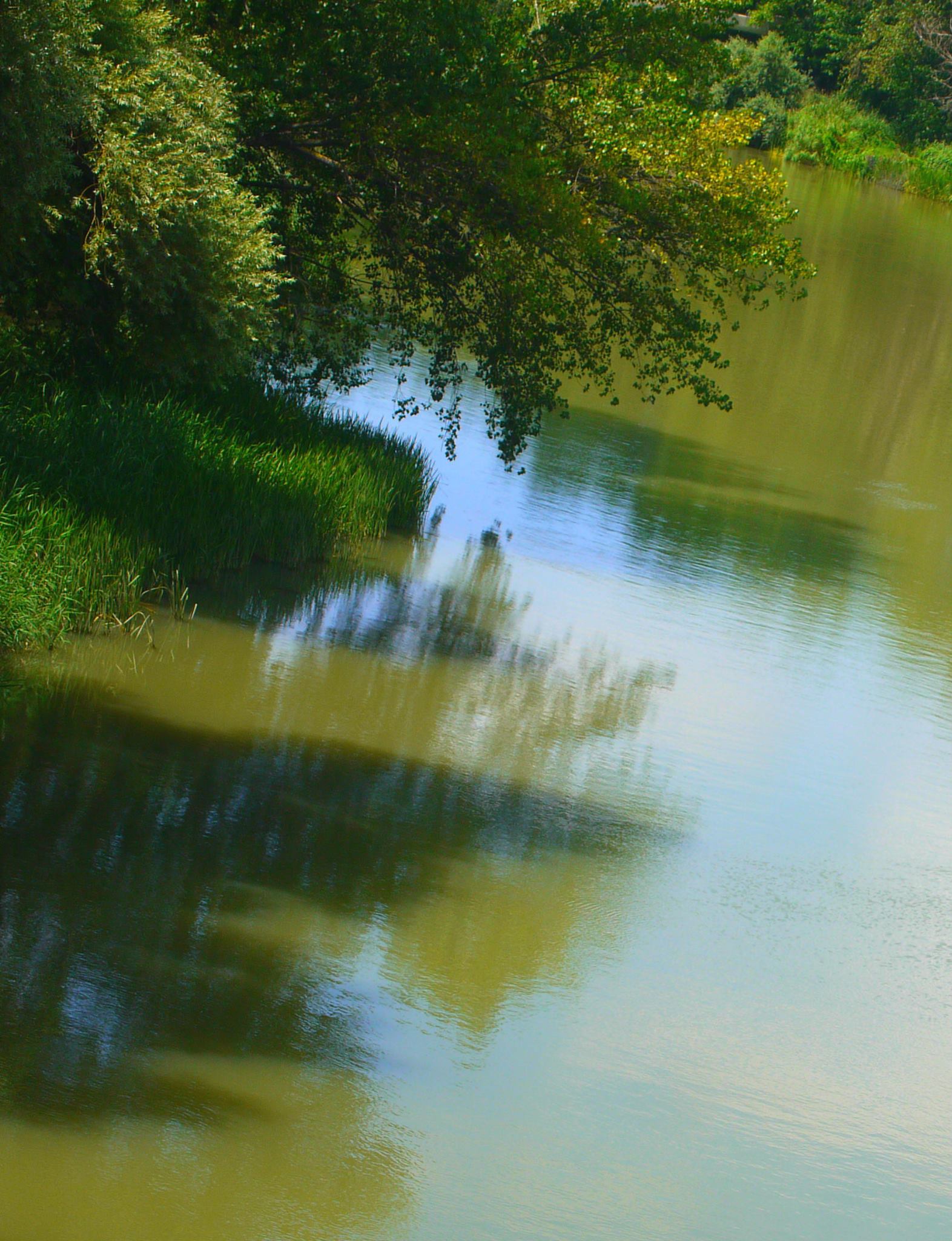 Description: A body of water with a tree and grass in the background and a few people on a boat in the water.