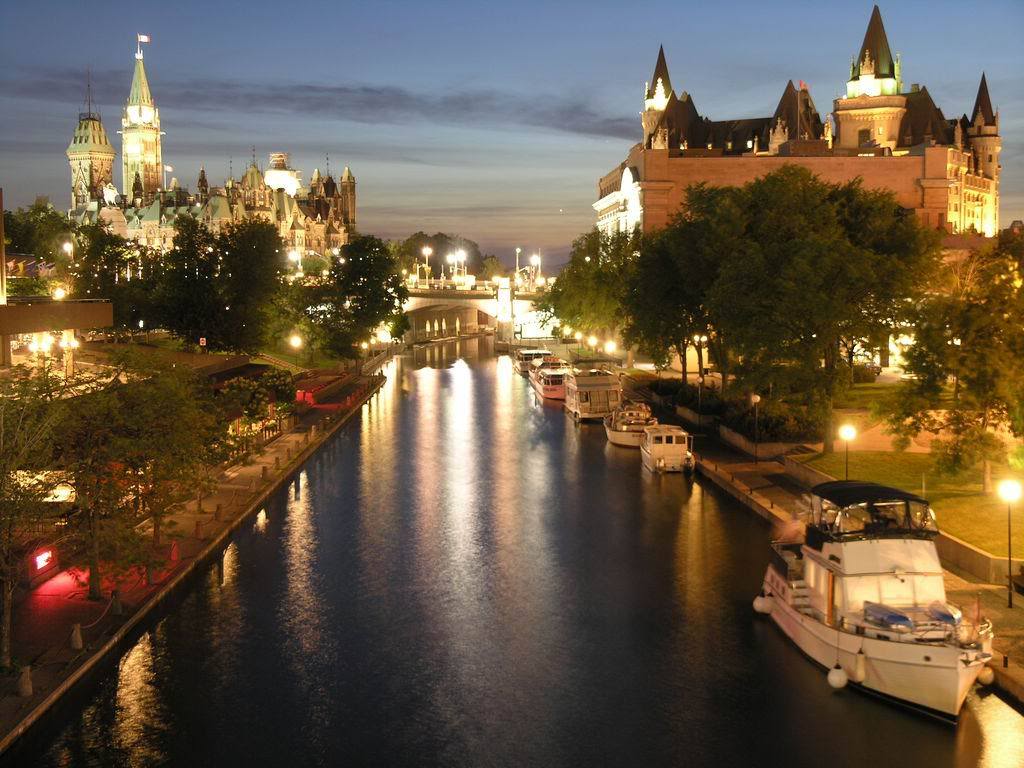 Description: A river with boats on it and a city in the background at night time with lights on the buildings.