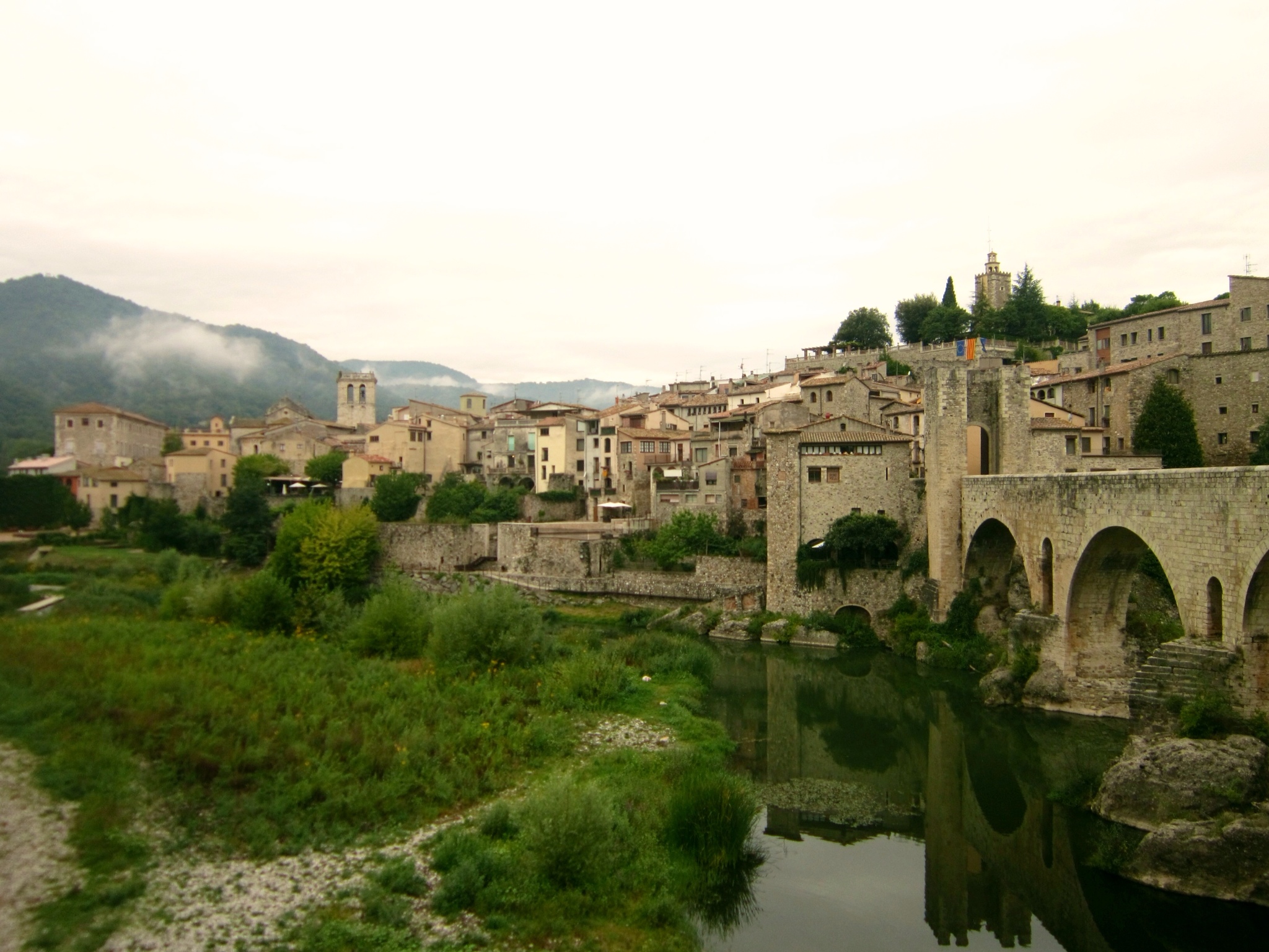Description: A river running through a small town next to a forest covered hillside with a bridge over it and a few buildings.