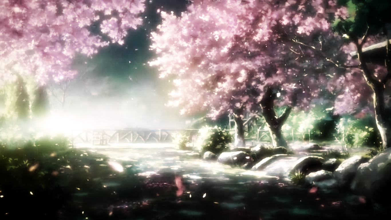 Description: A painting of a river with a bridge in the background and trees in the foreground with a light shining through the trees.