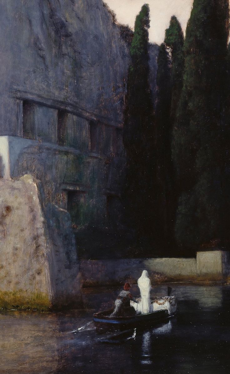 Description: A painting of a man in a boat in a river near a building and trees on a cliff face.