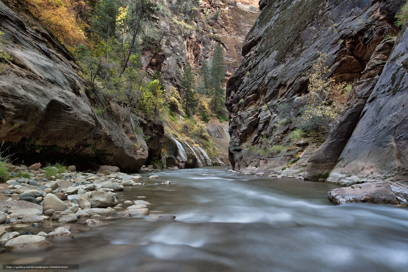 Description: A river flowing through a canyon surrounded by rocks and trees in the mountains of a canyon with a waterfall.