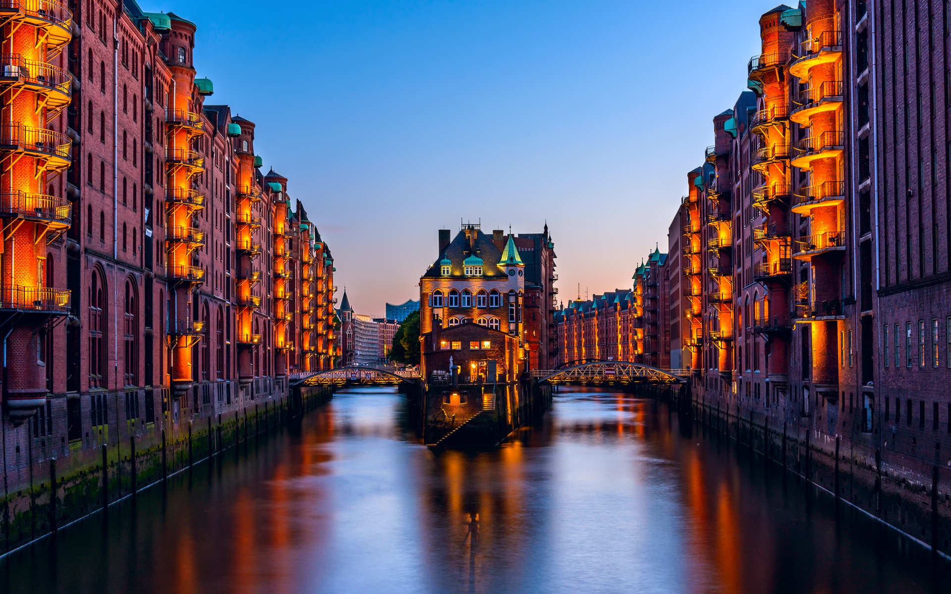 Description: A river running through a city next to tall buildings at night time with lights on them and a bridge in the middle.