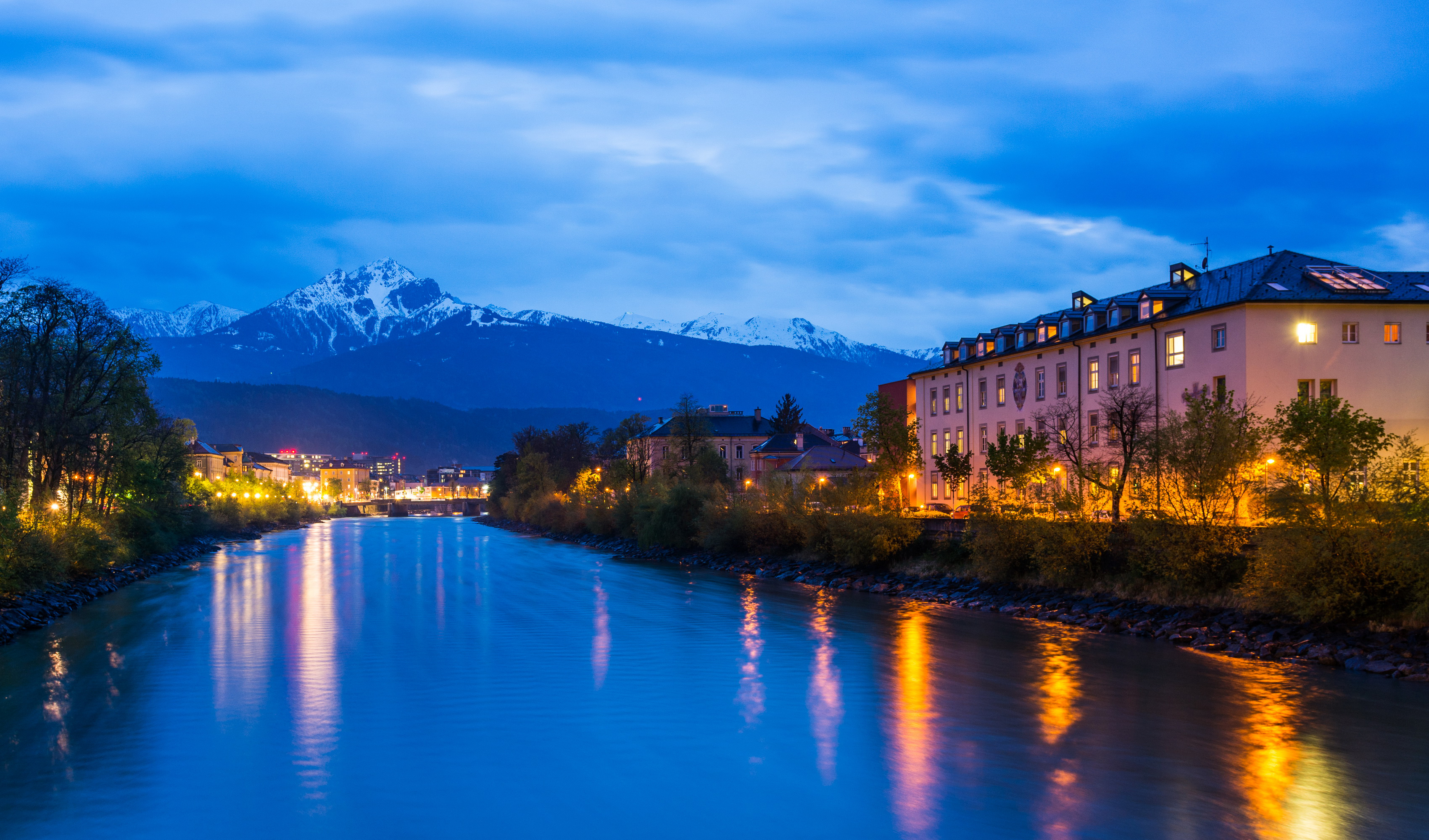 Description: A river running through a city with a mountain in the background at night time with lights on the buildings.