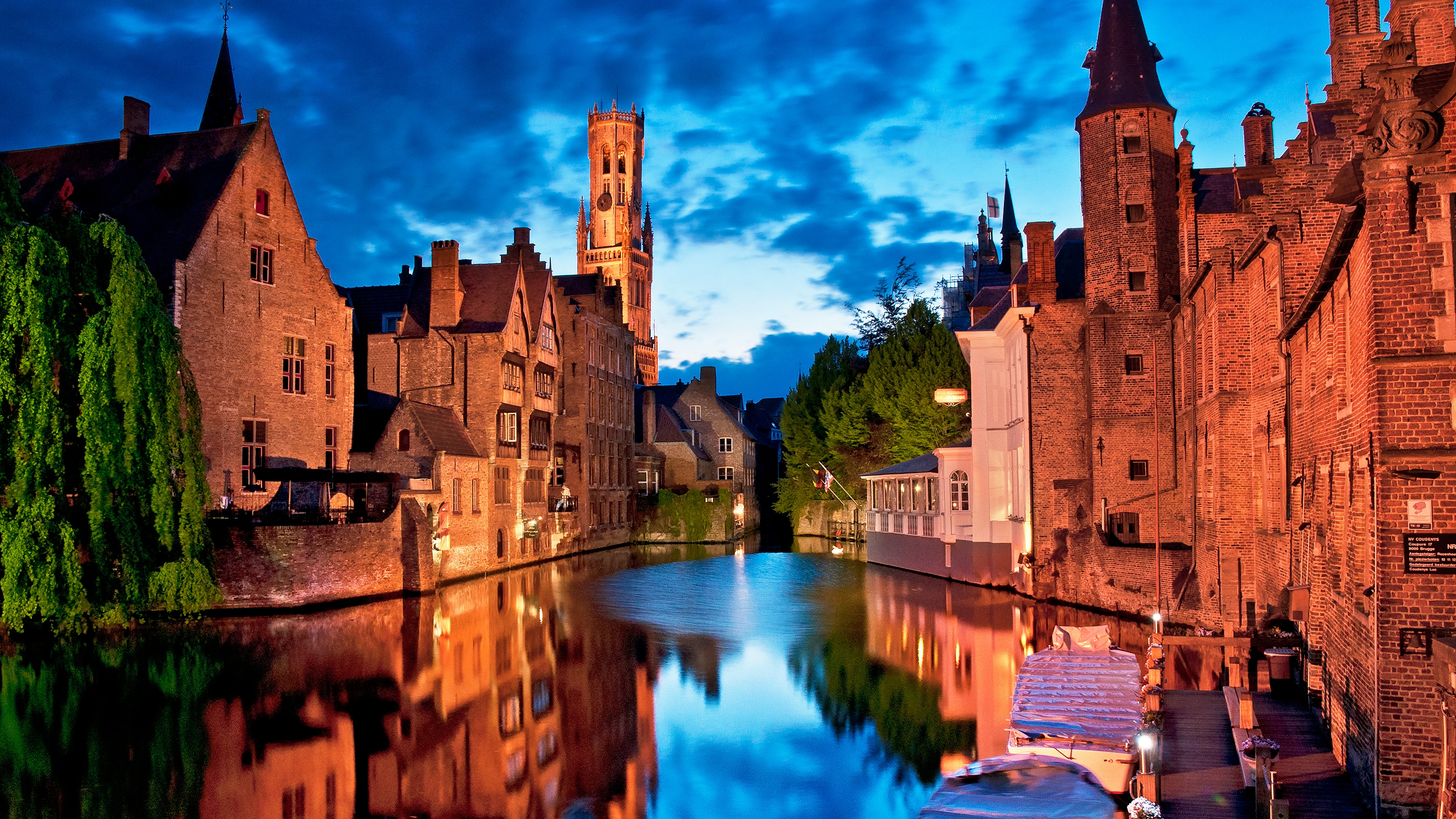 Description: A river running through a city next to tall buildings at night time with a clock tower in the background.