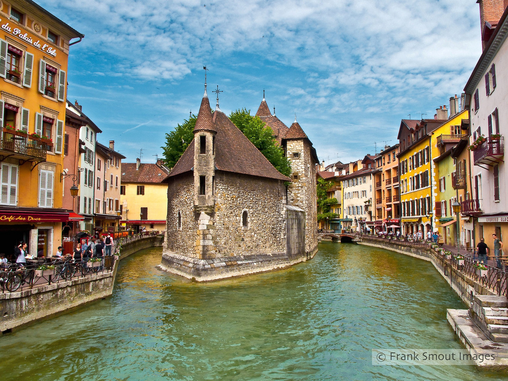 Description: A river running through a city next to tall buildings and a clock tower on top of it's side.