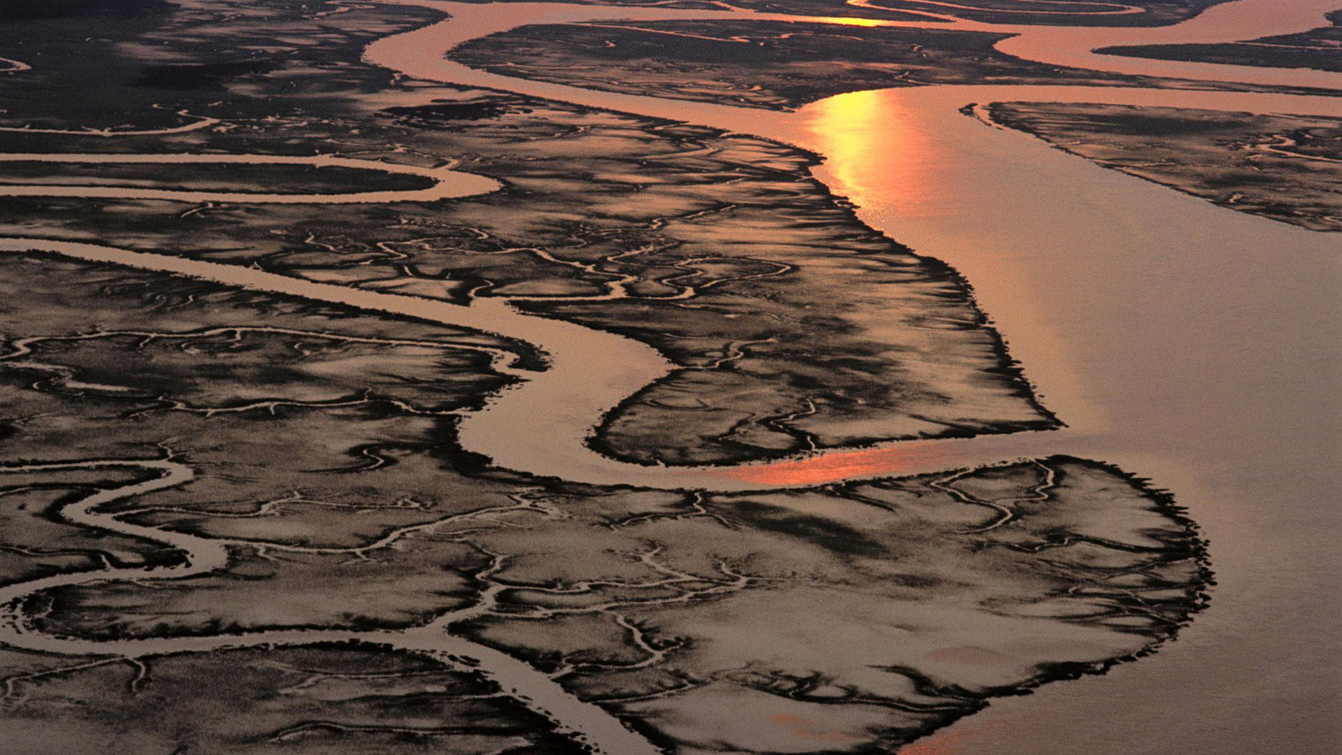 Description: A river that is next to a field with grass and water in it and a sunset in the distance.