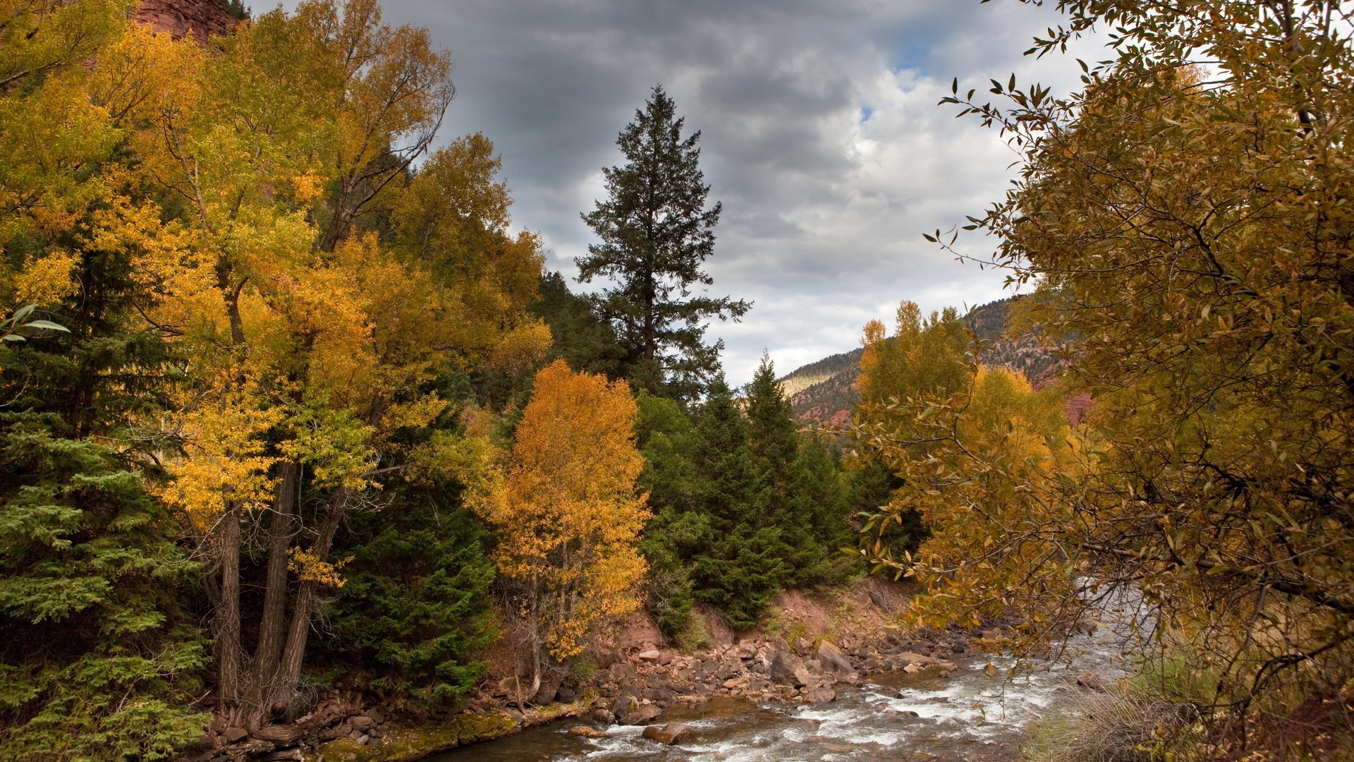 Description: A river running through a forest filled with trees covered in fall foliage and surrounded by tall trees with yellow leaves.