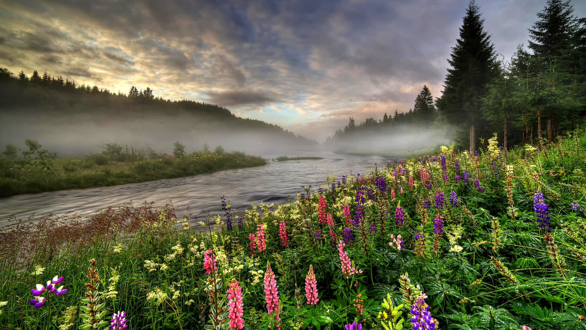 Description: A river surrounded by a forest filled with lots of flowers and trees on a cloudy day with a sun setting.