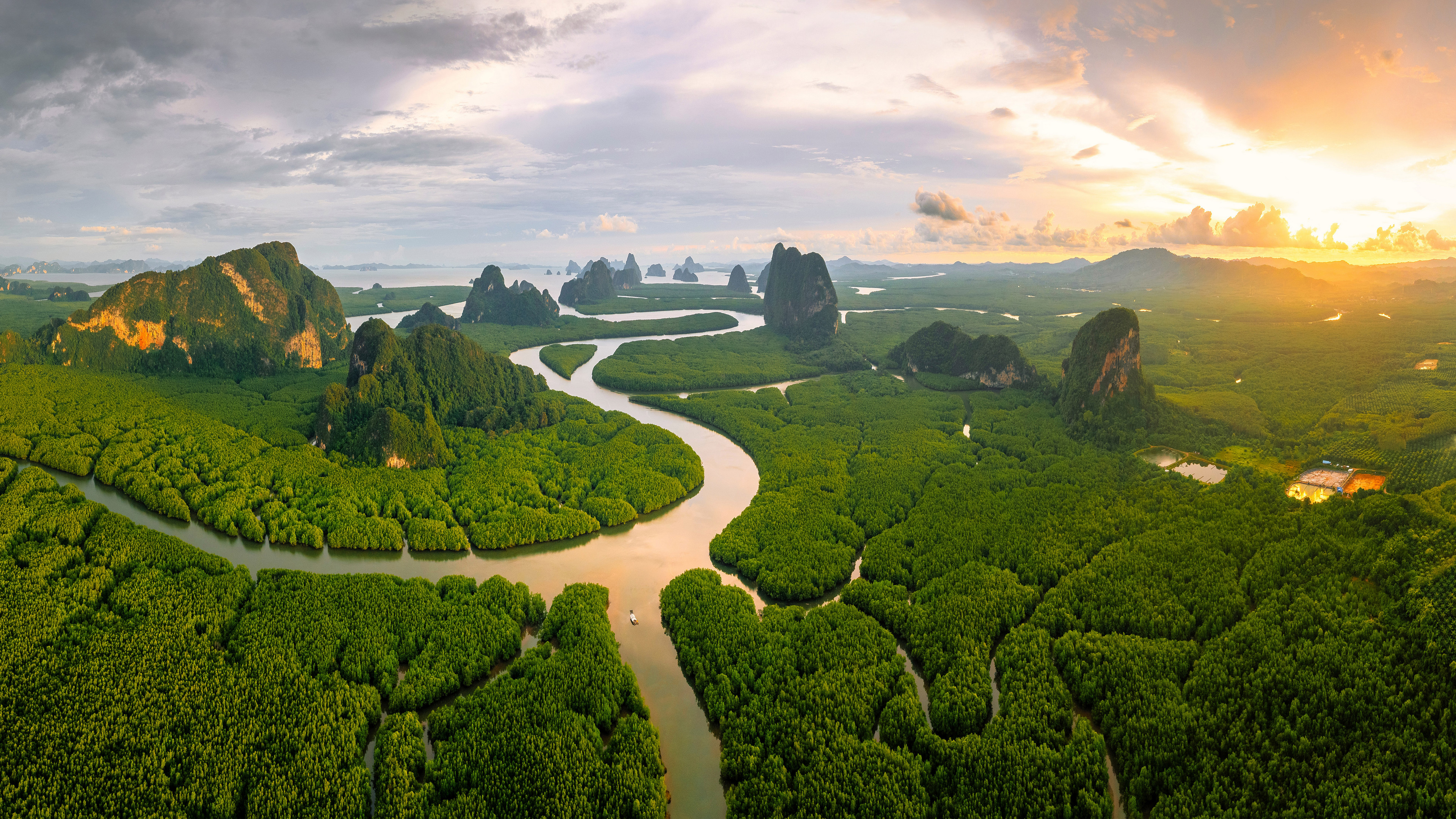Description: A river running through a lush green forest covered valley under a cloudy sky at sunset with a sun setting.
