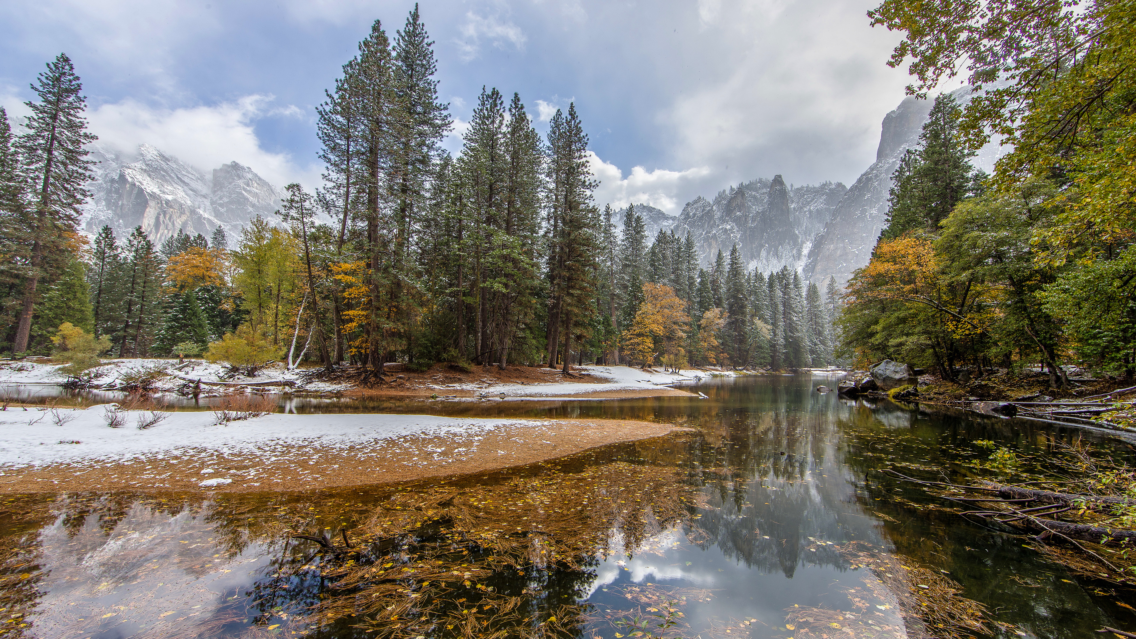 Description: A river surrounded by trees and snow covered mountains in the background with a cloudy sky above it and a few clouds in the sky.