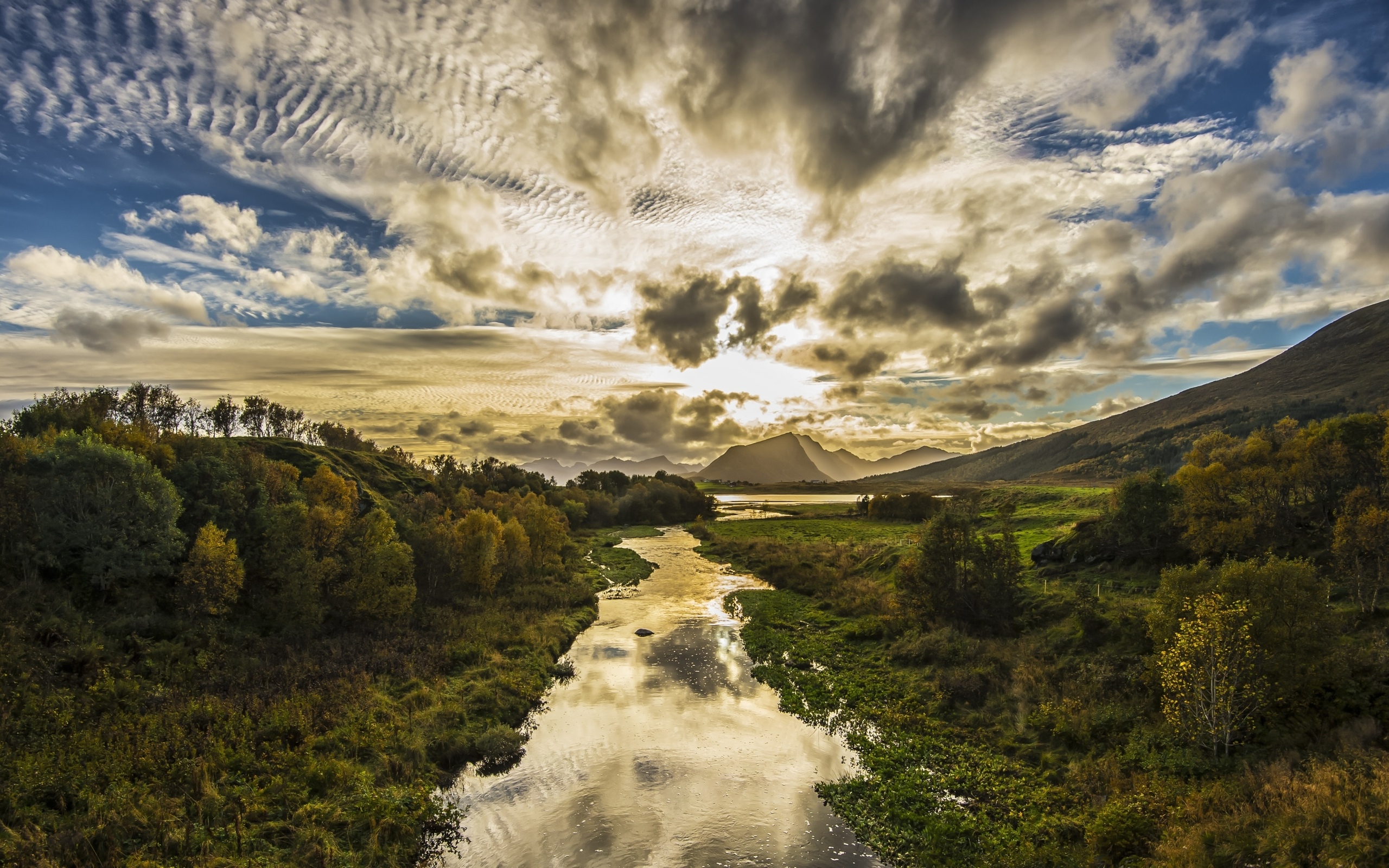 Description: A river running through a lush green forest under a cloudy sky with mountains in the distance and a sun setting.