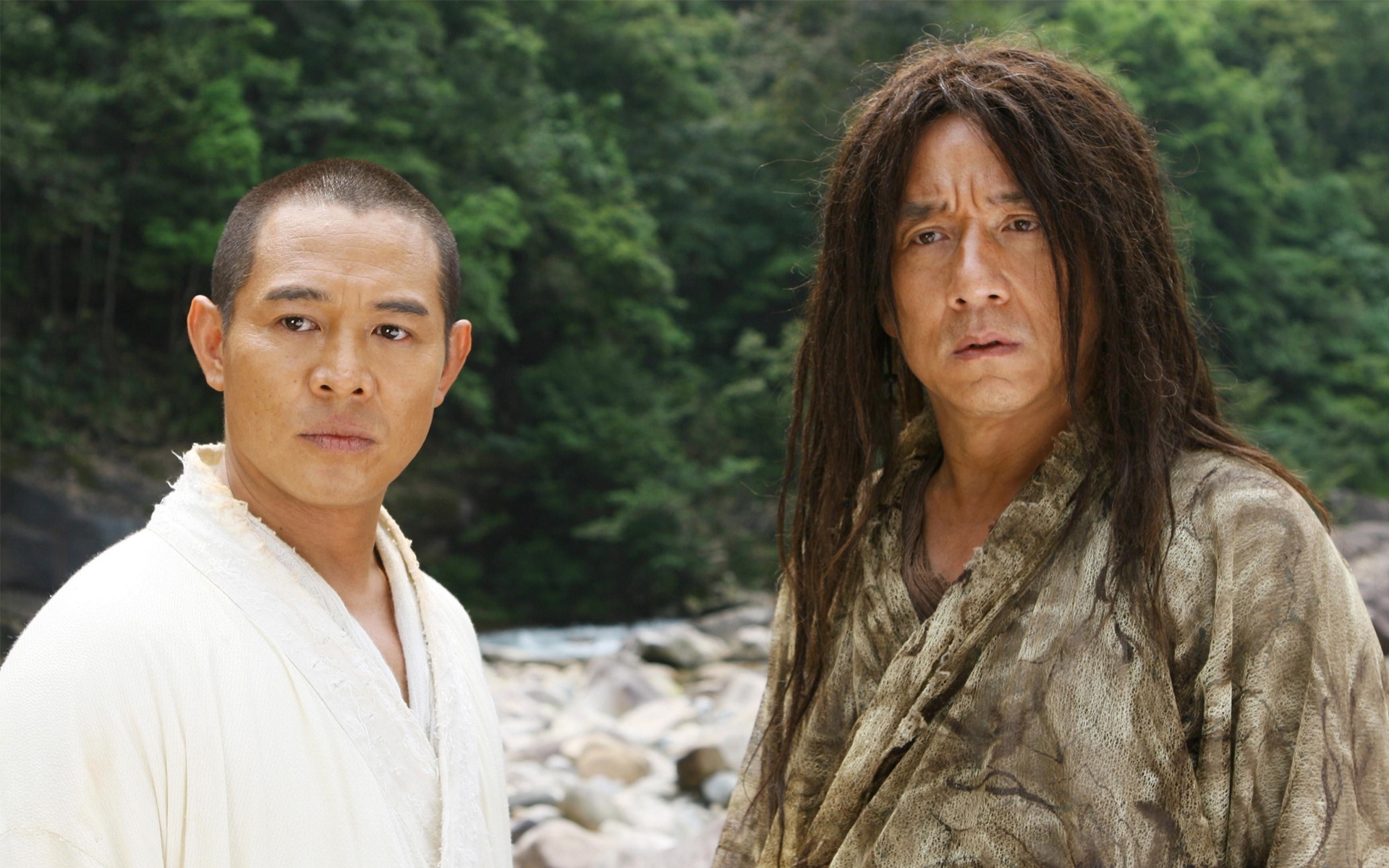 Description: Two men standing next to each other near a river and trees in the background.