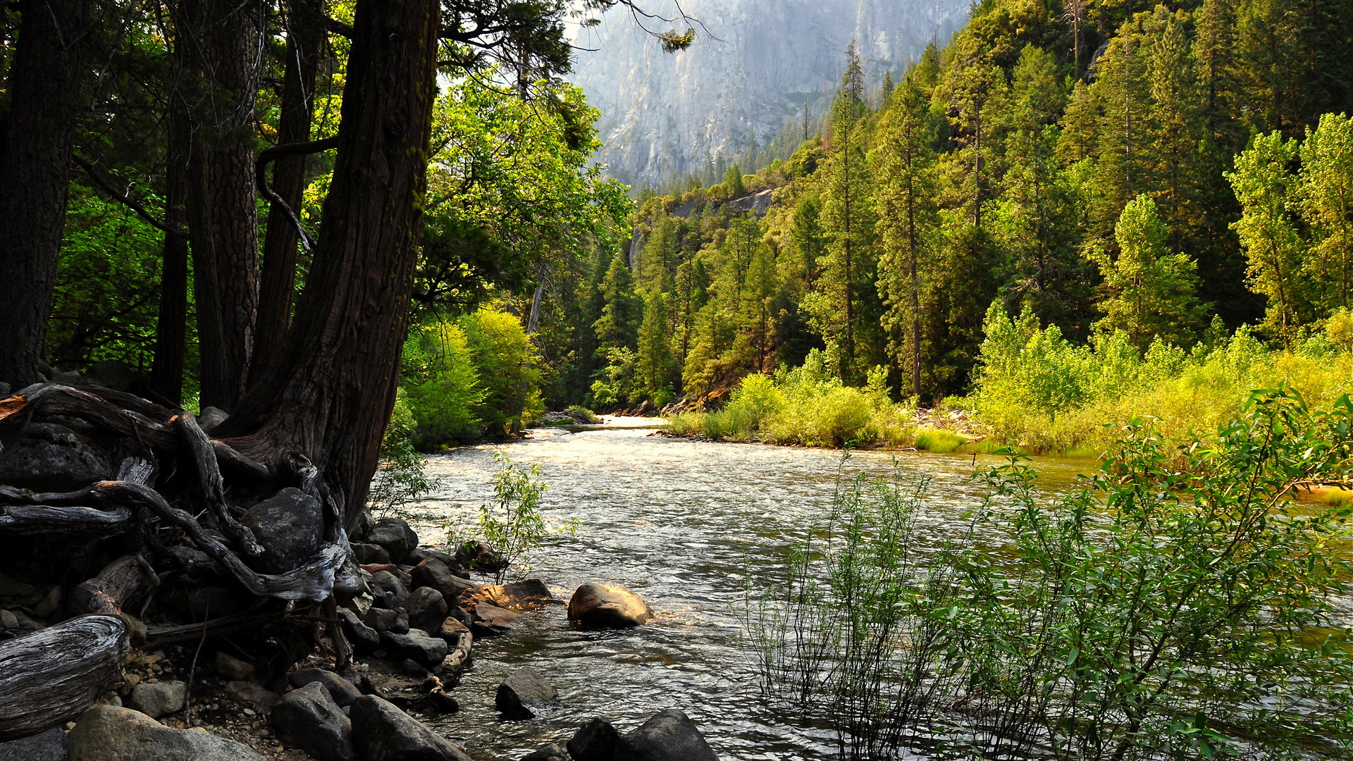 Description: A river running through a forest filled with trees and rocks and a fallen tree trunk in the foreground.