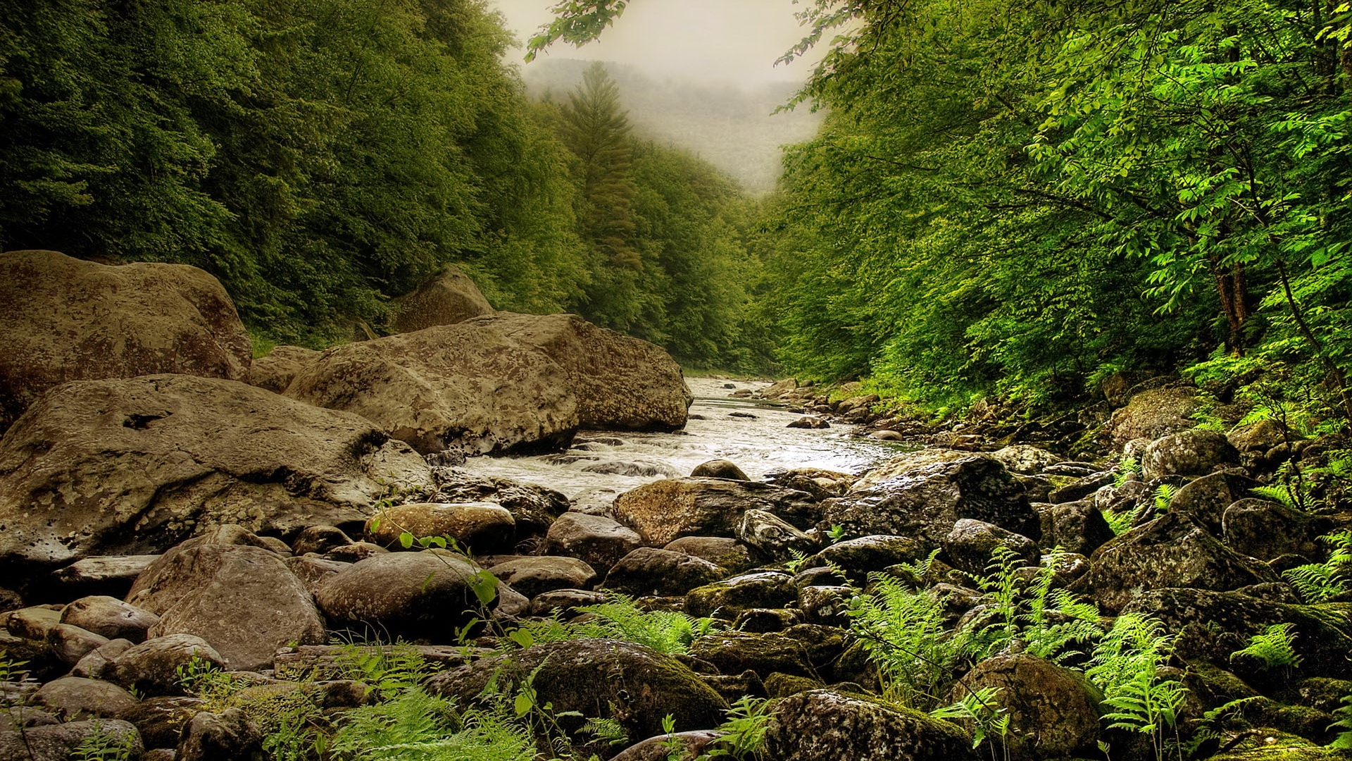 Description: A river running through a lush green forest filled with rocks and trees.