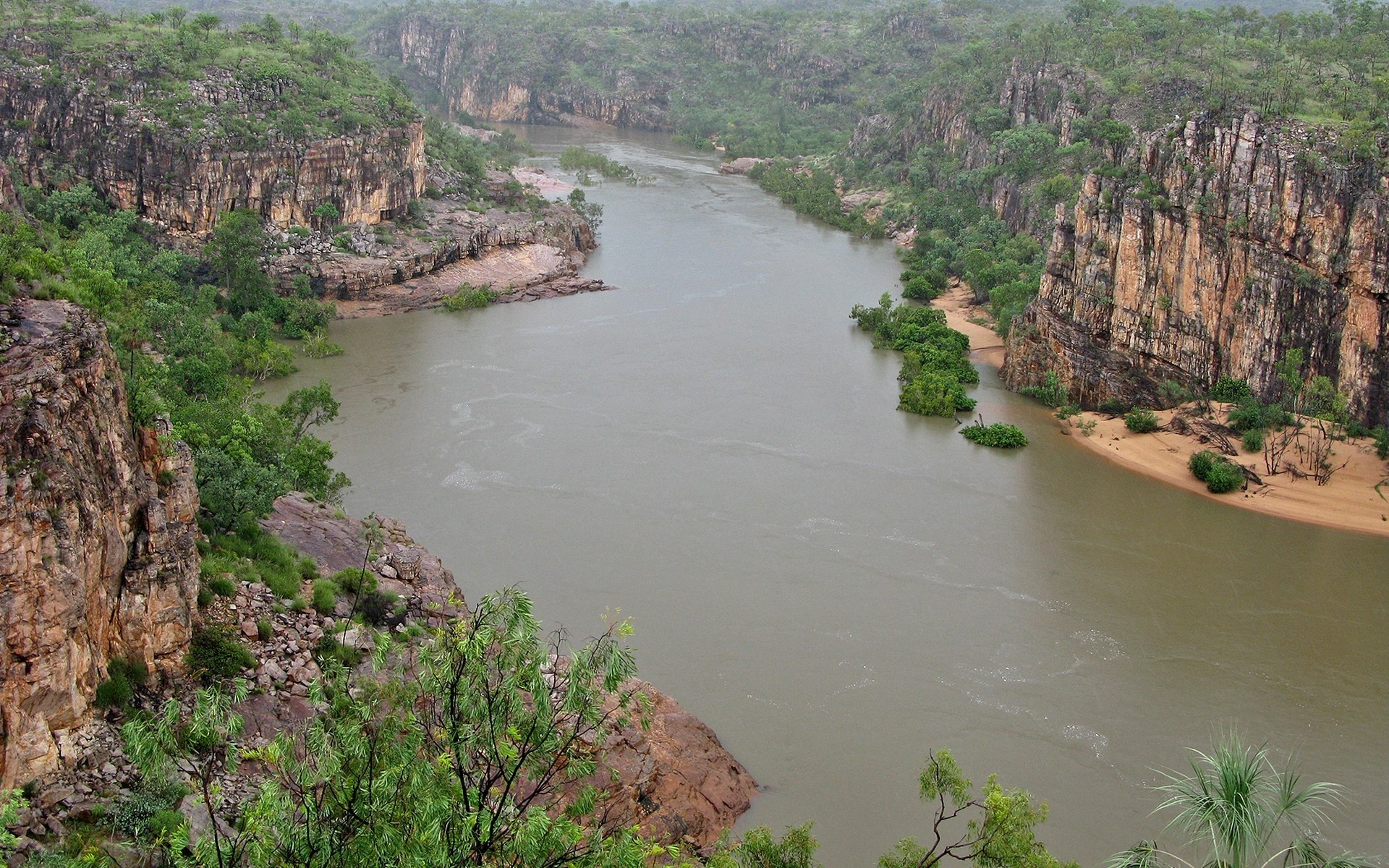 Description: A river surrounded by trees and rocks in a forest area with a sky background and a few clouds in the sky.