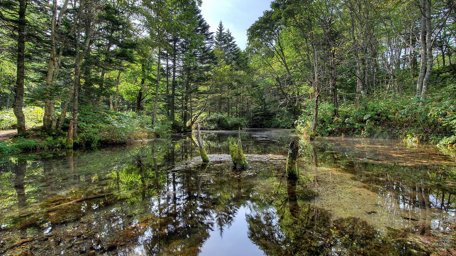 Description: A river surrounded by trees and a forest filled with lots of trees and water in the middle of the forest.