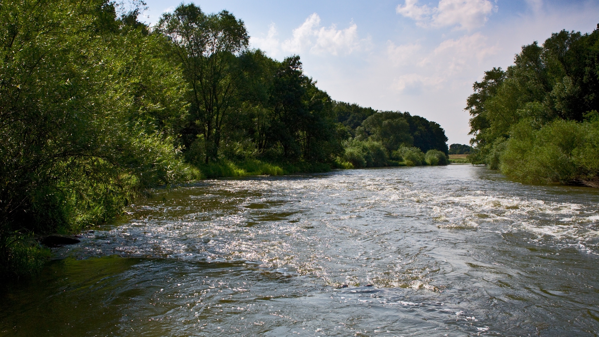 Description: A river running through a lush green forest filled with trees and water flowing through it's sides.