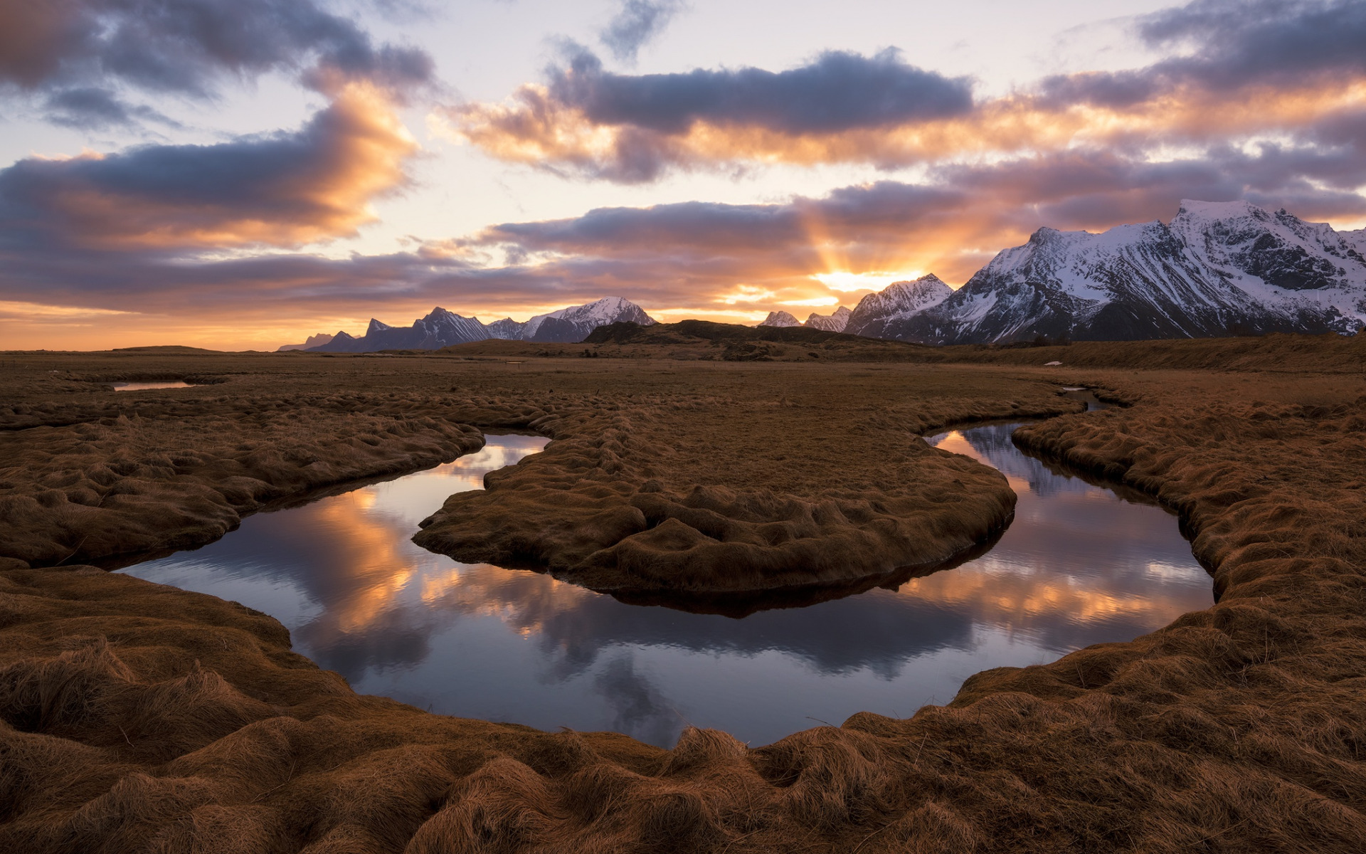 Description: A river running through a grass covered field under a cloudy sky with mountains in the background and a sunset.