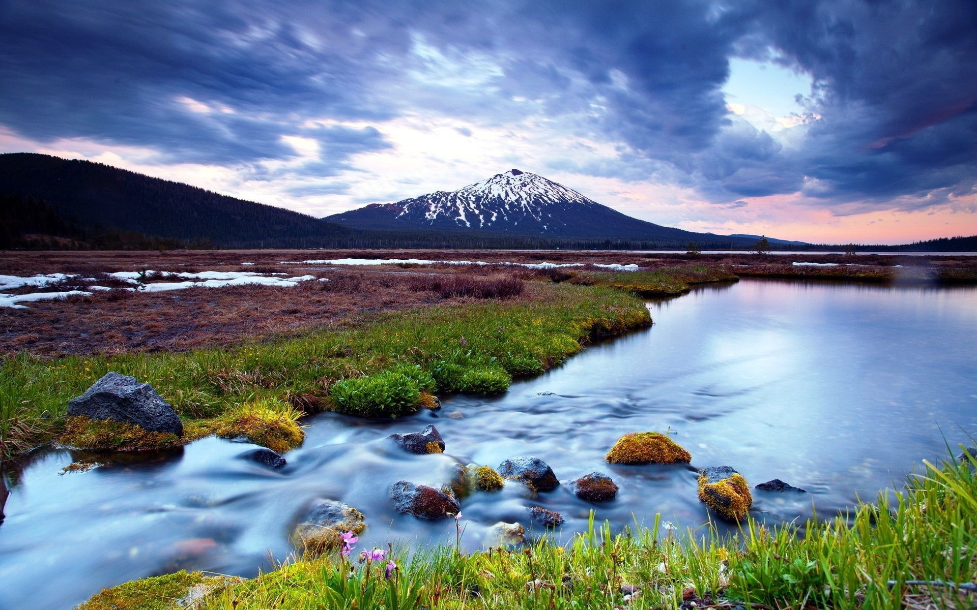 Description: A river running through a lush green field under a cloudy sky with a mountain in the background and a few flowers growing on the bank.