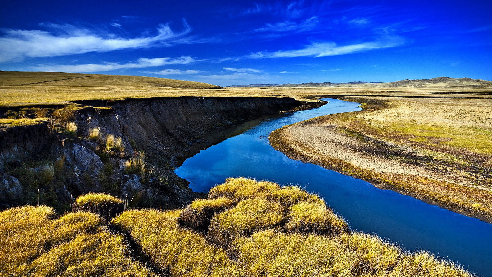 Description: A river running through a dry grass covered field next to a hillside with a blue sky above it and a grassy area below.
