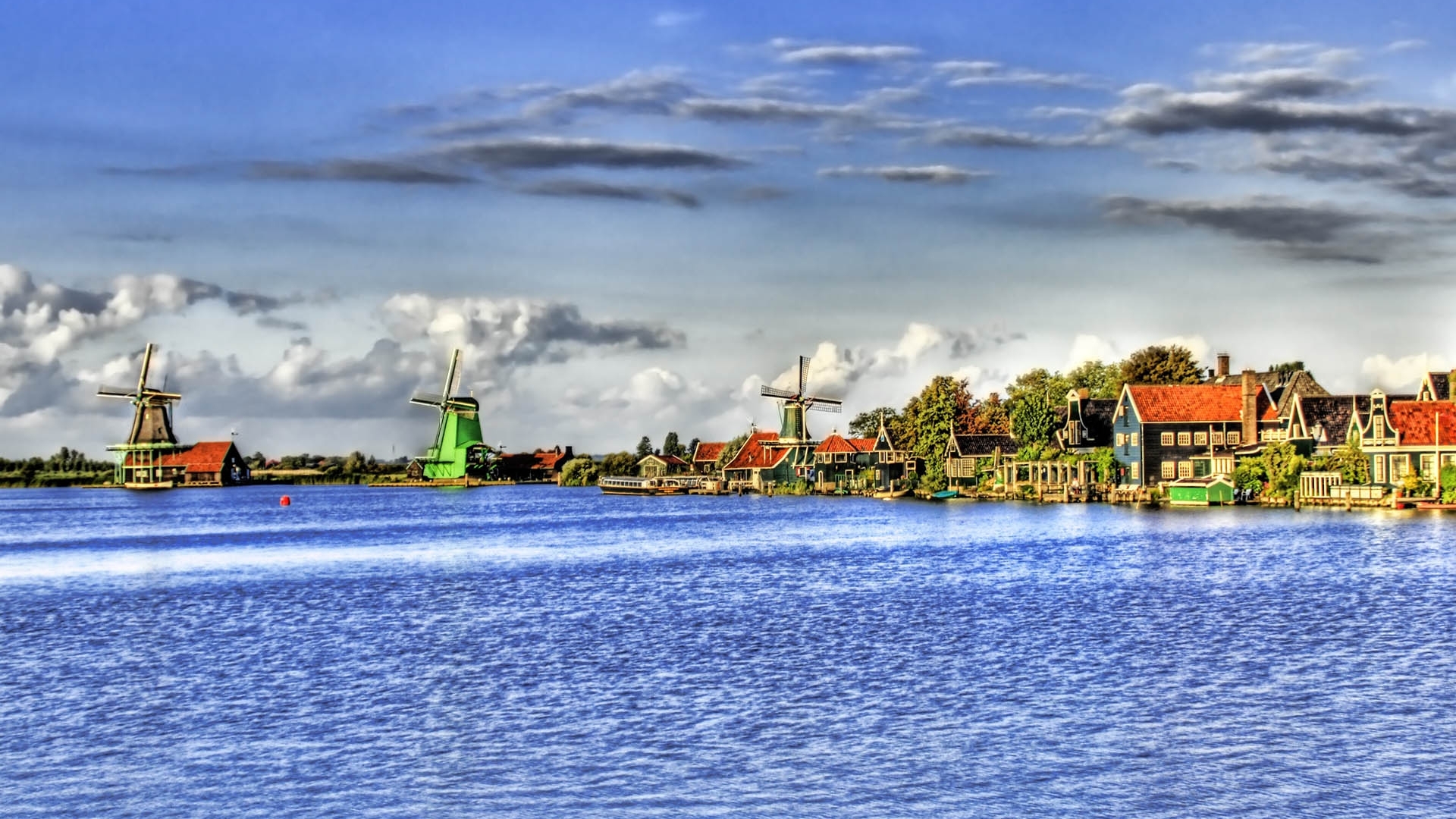 Description: A river with a bunch of houses and windmills in the background and a cloudy sky above it with a boat in the water.