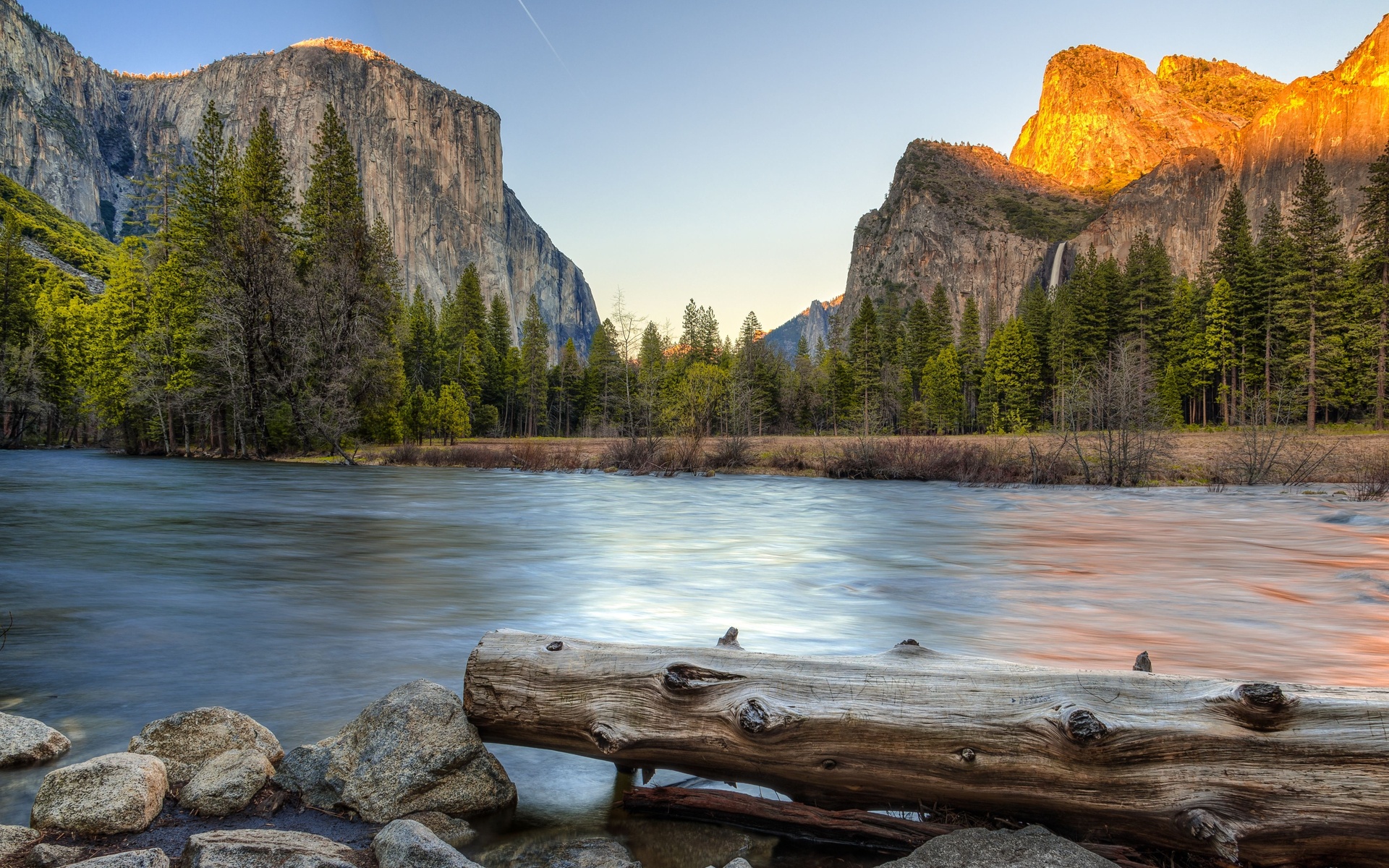 Description: A river with a log in the middle of it and mountains in the background with trees and rocks around it.