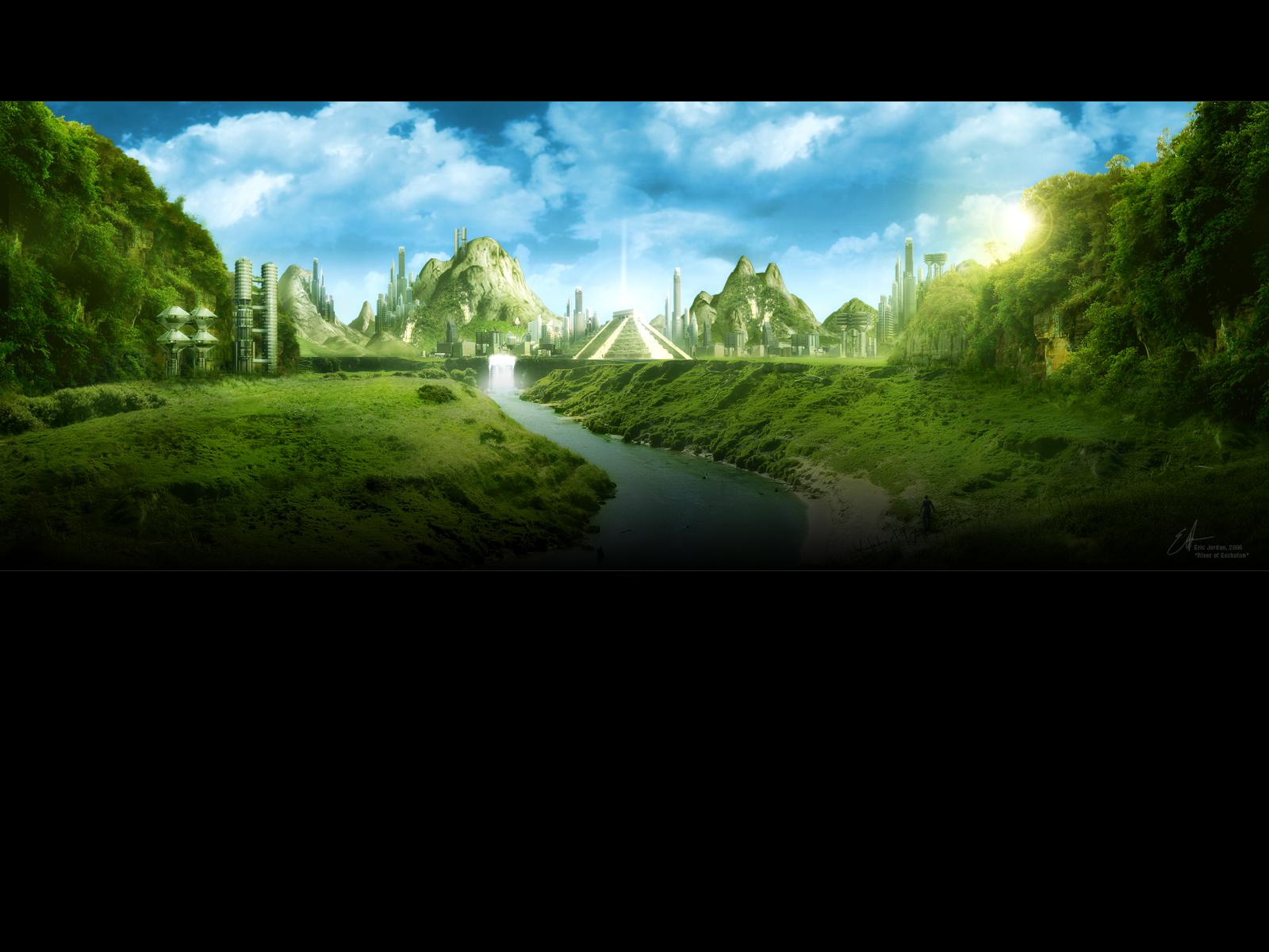 Description: A painting of a river running through a lush green forest with a sky background and clouds above it.