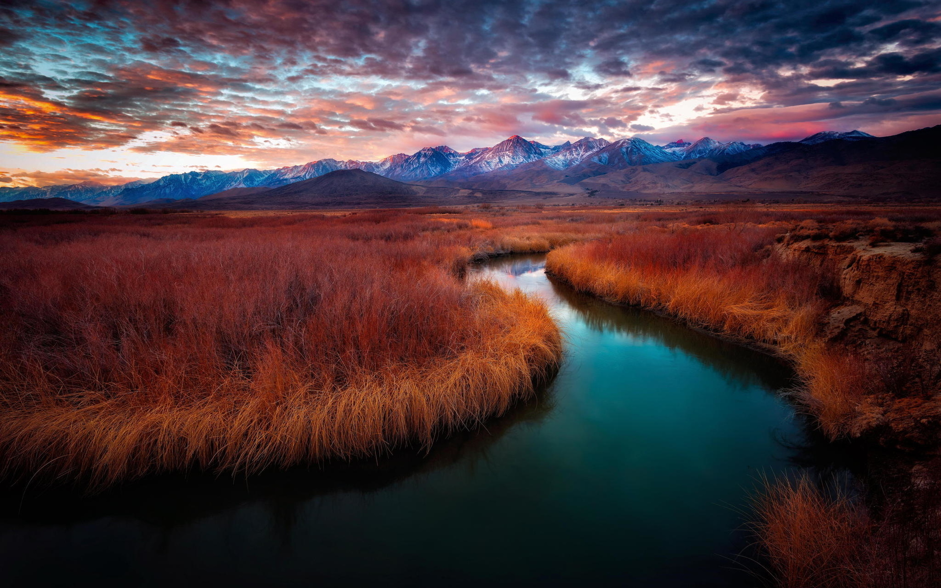 Description: A river running through a lush green field under a cloudy sky with mountains in the background at sunset or dawn.
