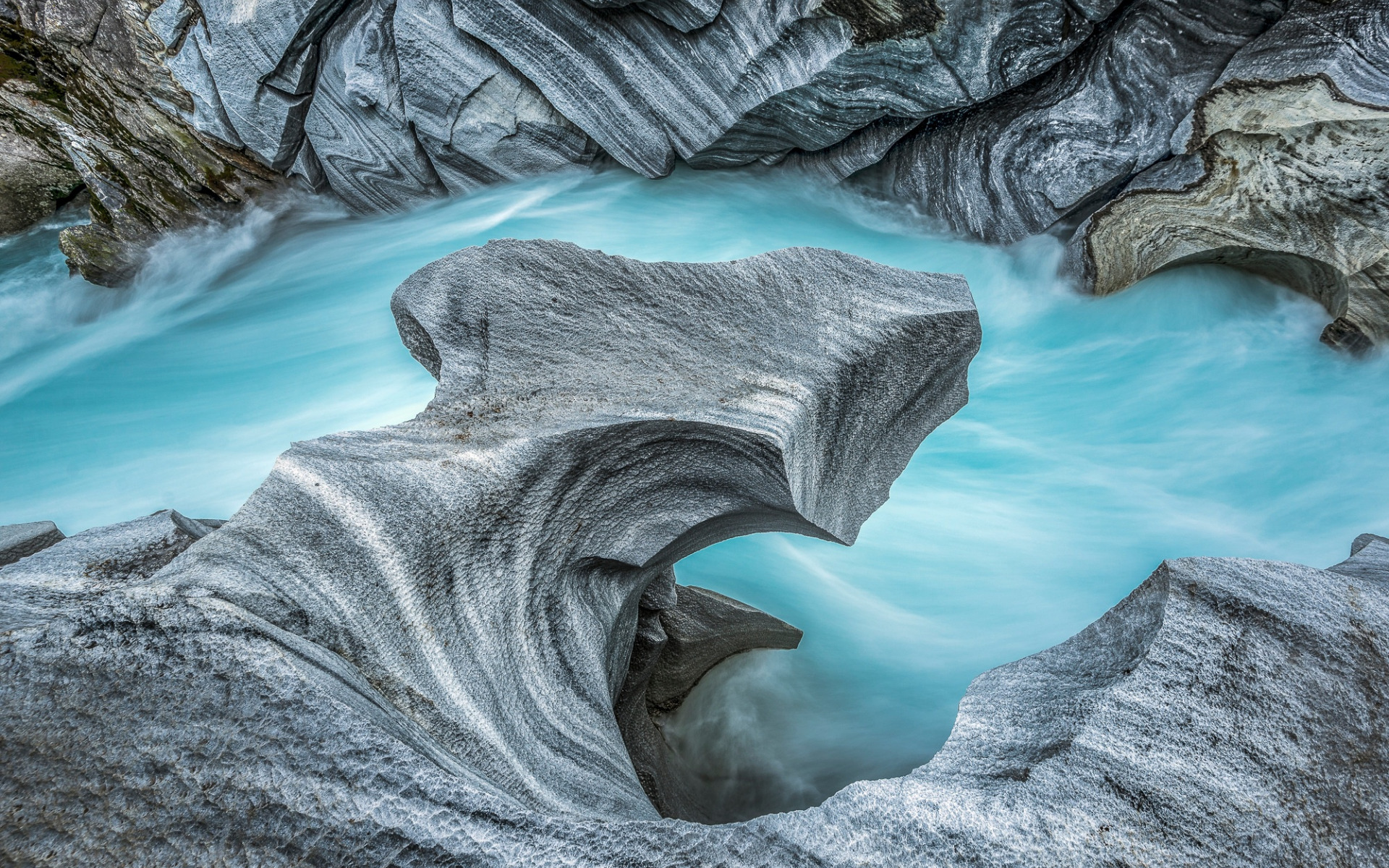 Description: A river with a rock formation in it and a blue water flowing through it and a rock formation in the middle.