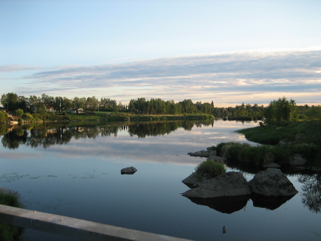 Description: A river with rocks in the water and a sky background with clouds in the distance and a few trees.