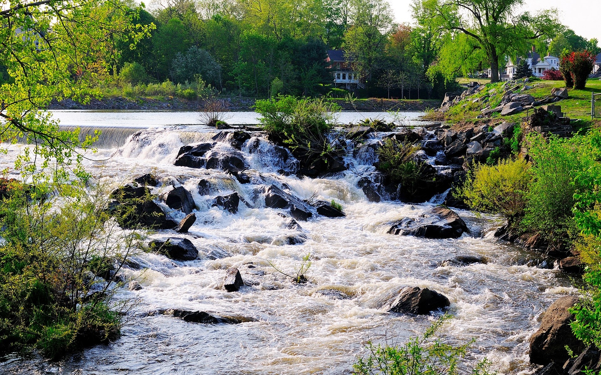 Description: A river with a bunch of rocks in it and trees around it and houses in the background and a few trees in the foreground.