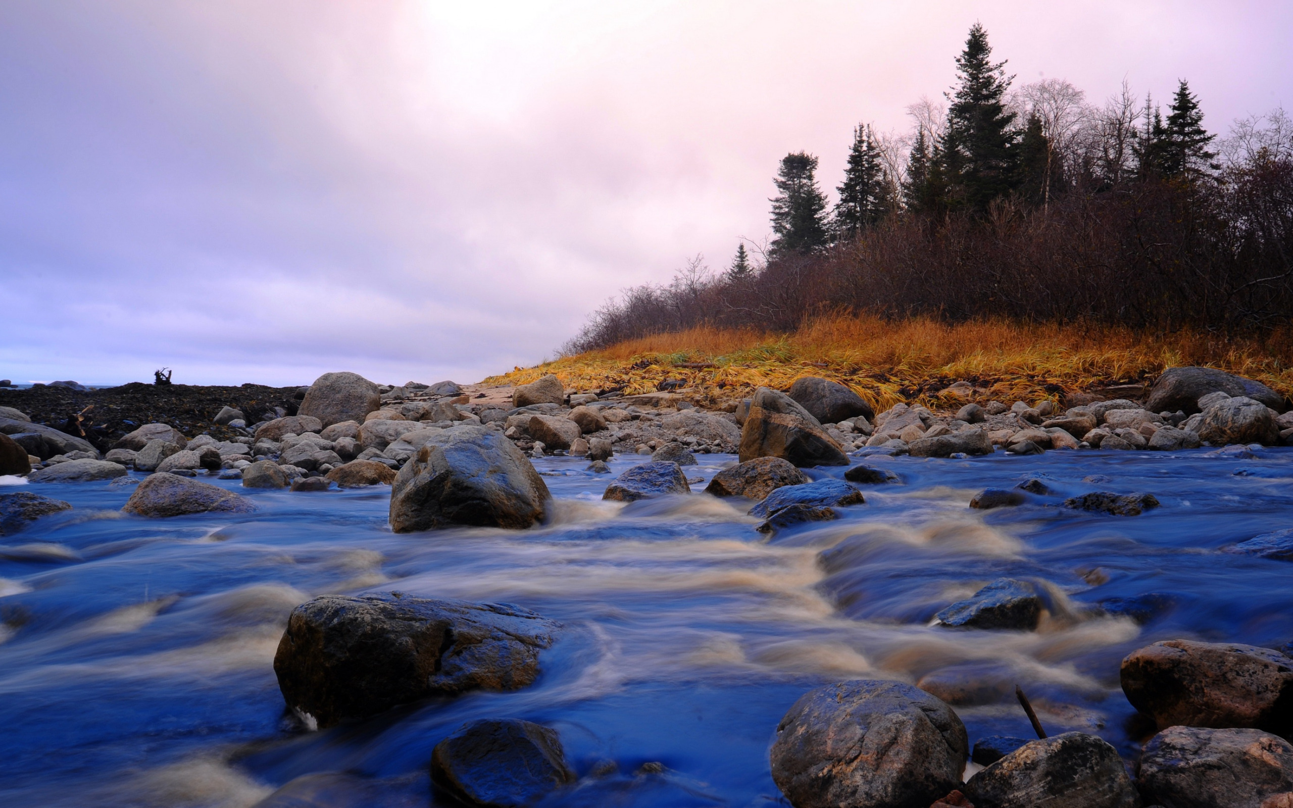 Description: A river with rocks and water running through it and trees in the background with a cloudy sky above it.