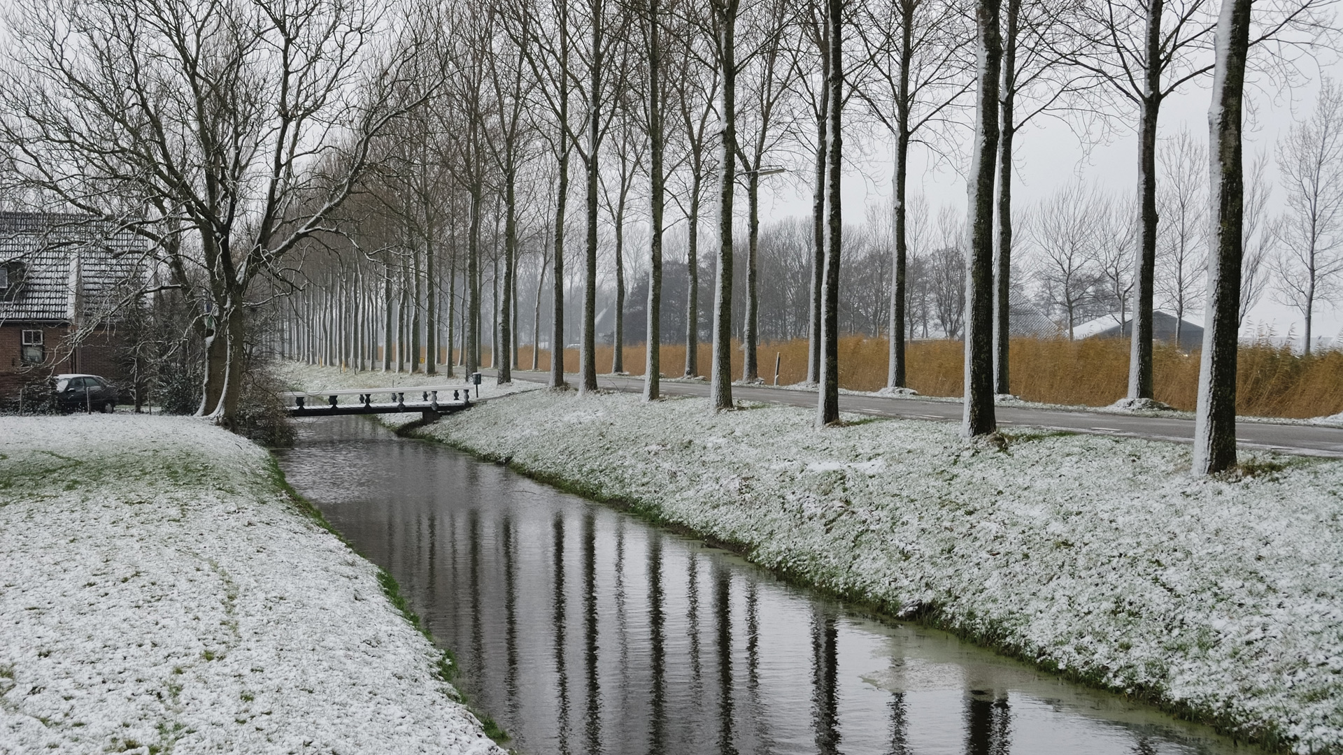 Description: A river running through a snow covered park next to a road and trees with snow on them and a bridge.
