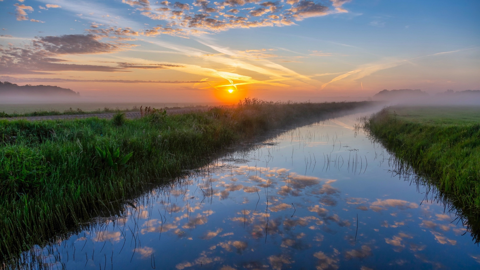 Description: A river with a sunset in the background and clouds in the sky above it and grass in the foreground.